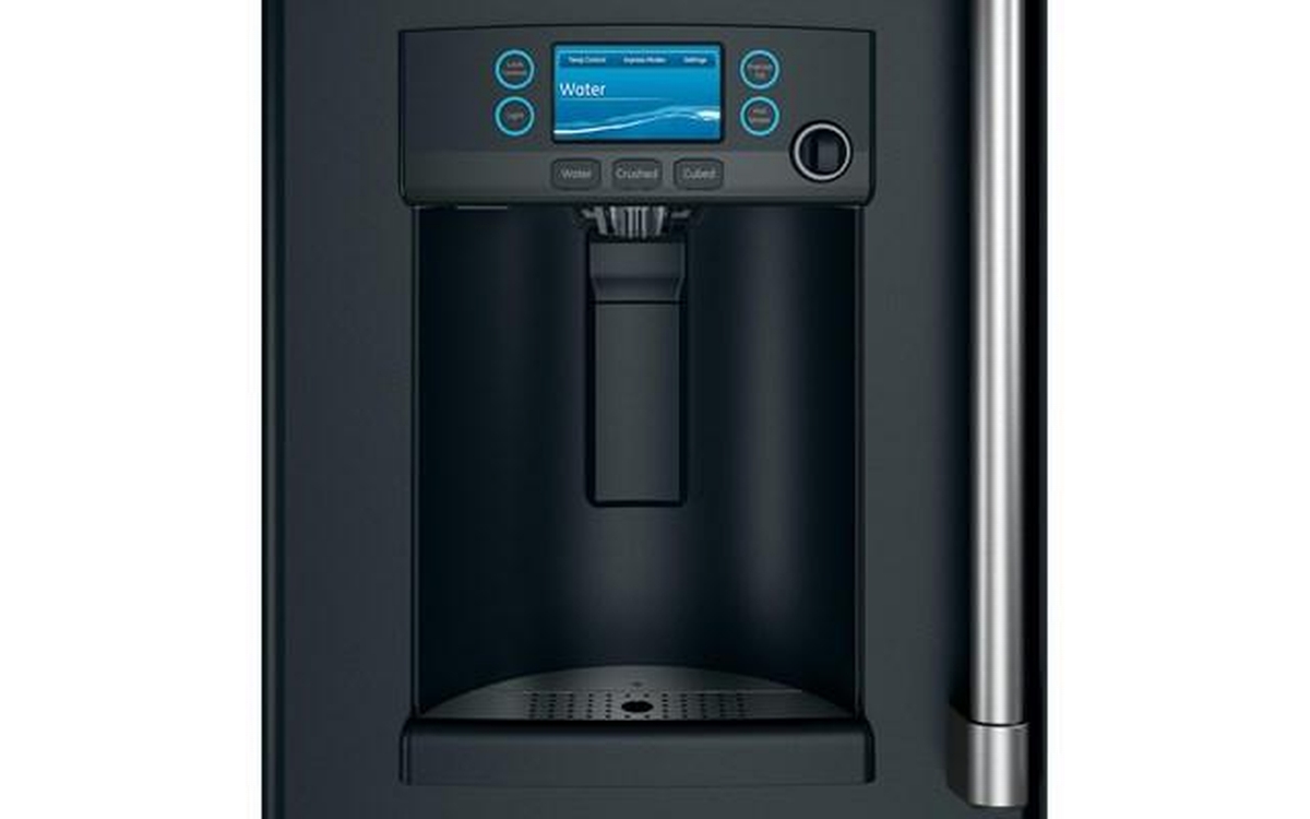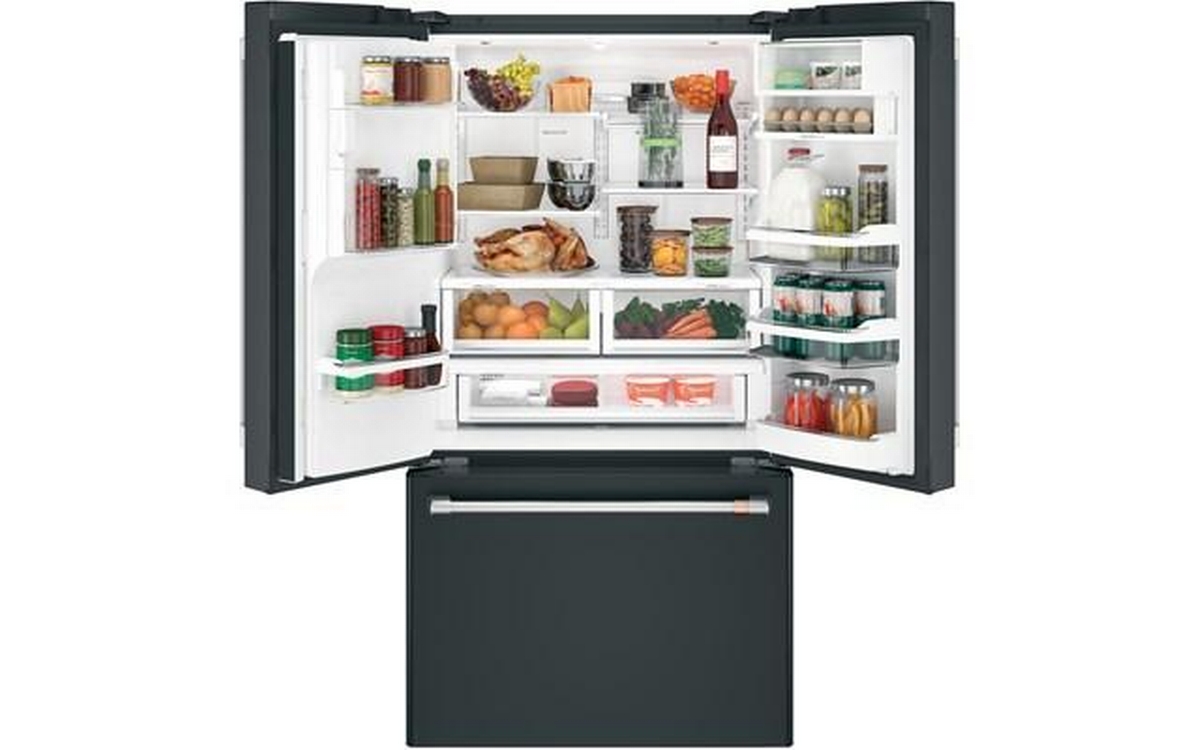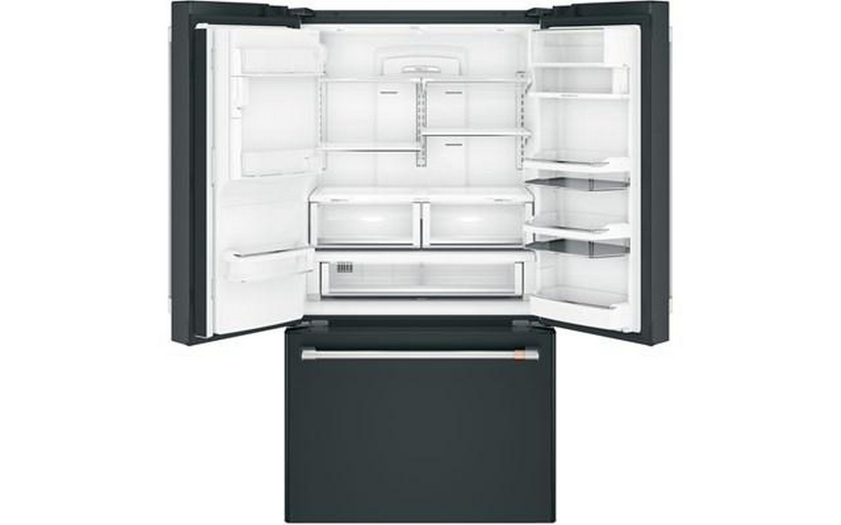 This Café Series 36-inch counter-depth, french door refrigerator is equipped with an external water and ice dispensing system. This model also features a hot water dispenser, the turbo cool setting, TwinChill™ evaporators and 2 adjustable humidity drawers.