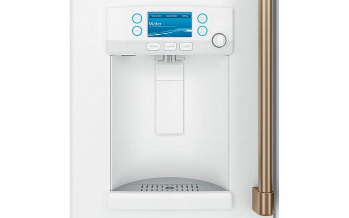 This Café Series 36-inch counter depth, french door refrigerator is equipped with an external water and ice dispensing system. This model also features a hot water dispenser, the turbo cool setting, TwinChill™ evaporators and 2 adjustable humidity drawers.