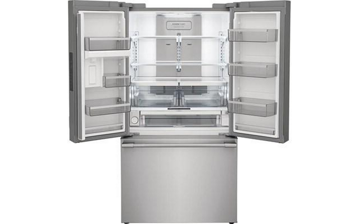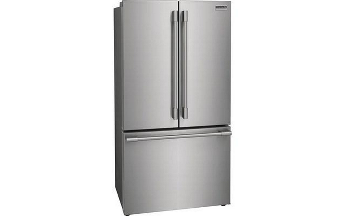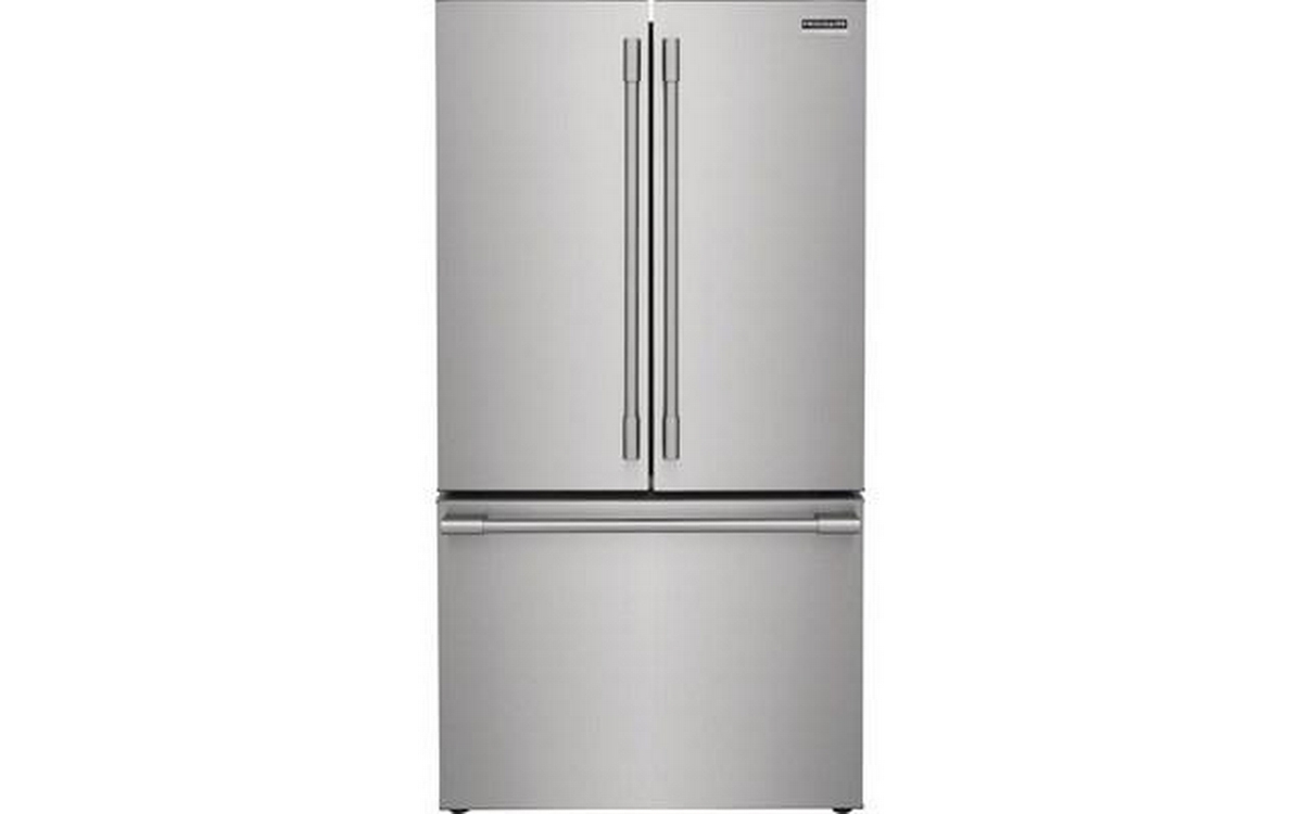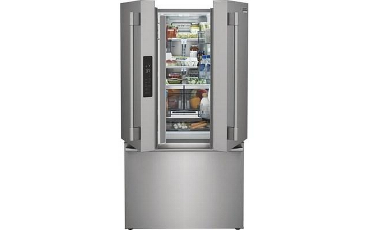 This 36-inch, counter-depth Frigidaire Professional french 3-door refrigerator features crisper drawers, a digital temperature display, interior water system, and glass shelves.