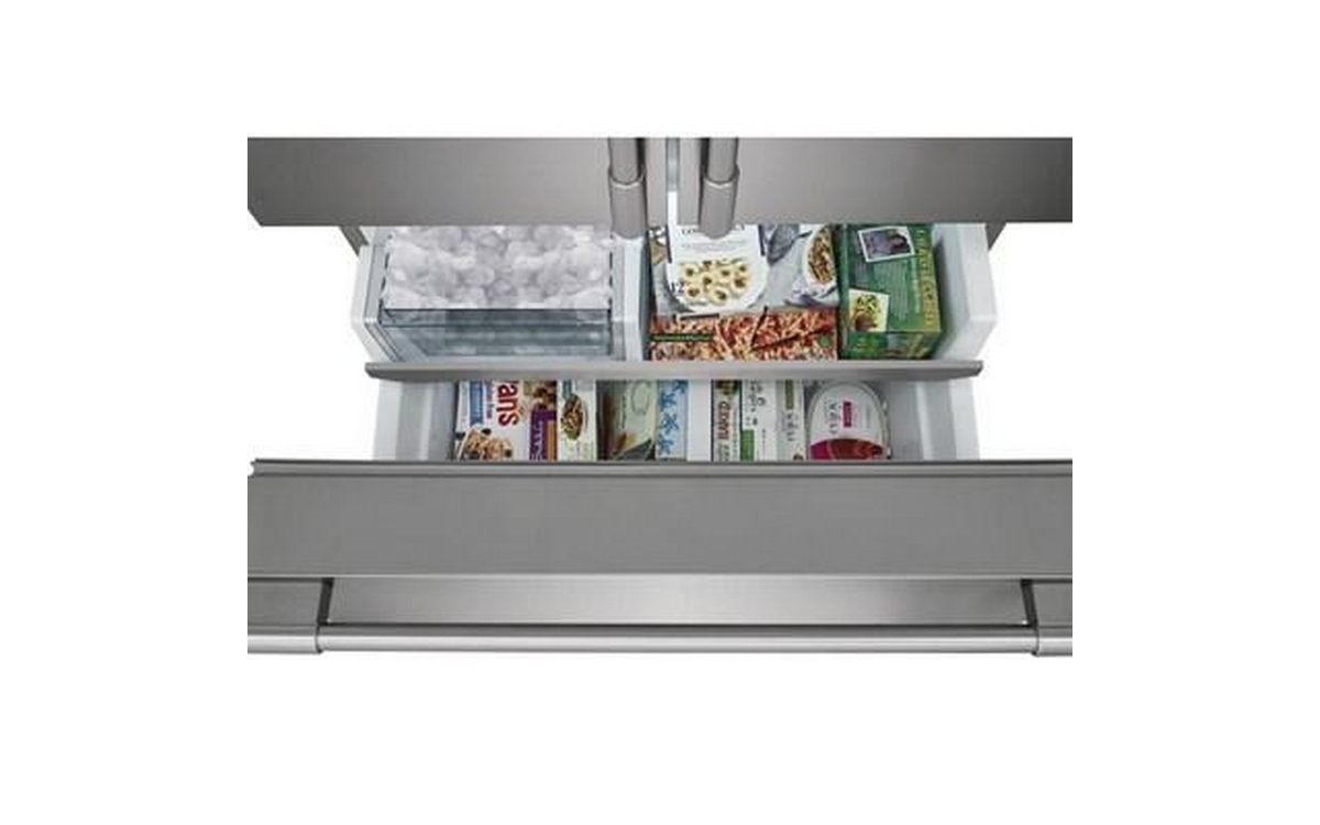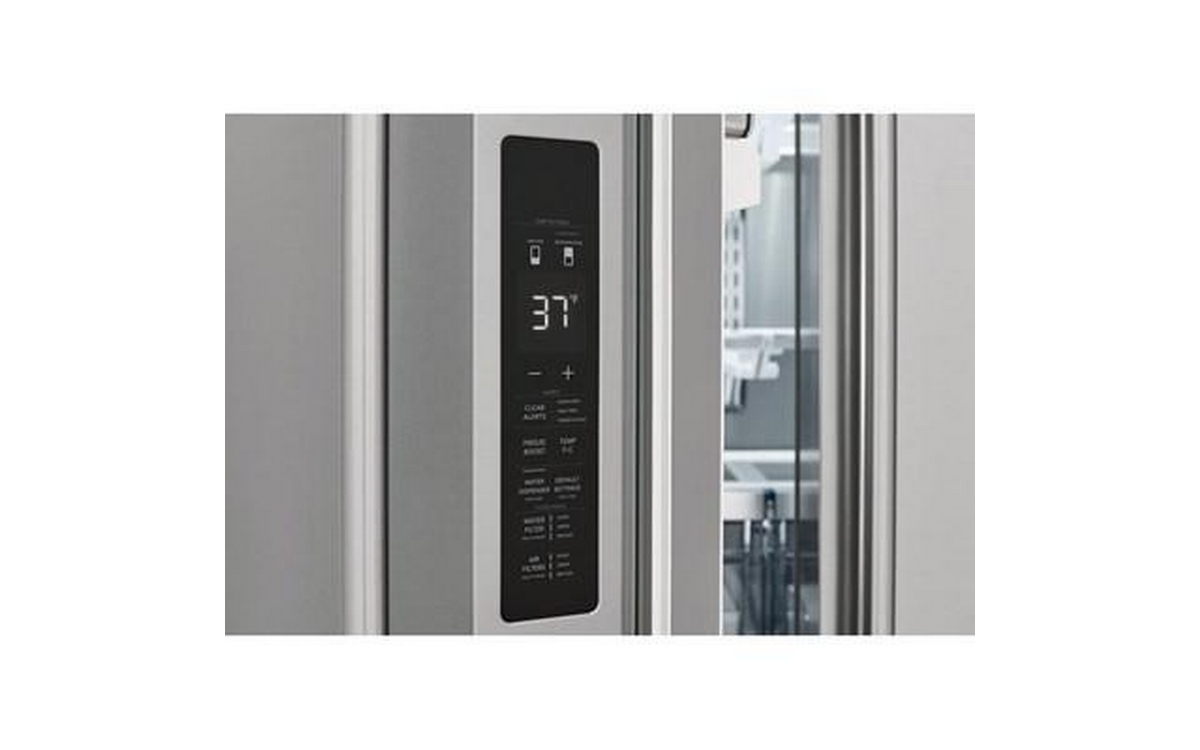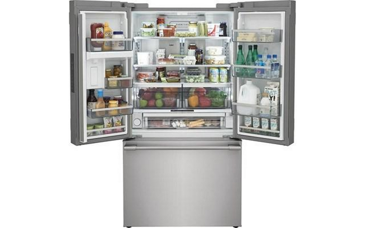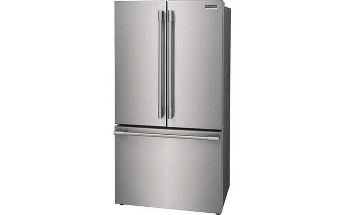This 36-inch, counter-depth Frigidaire Professional french 3-door refrigerator features crisper drawers, a digital temperature display, interior water system, and glass shelves.