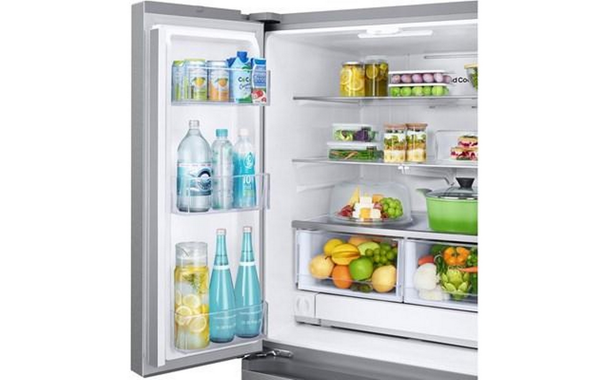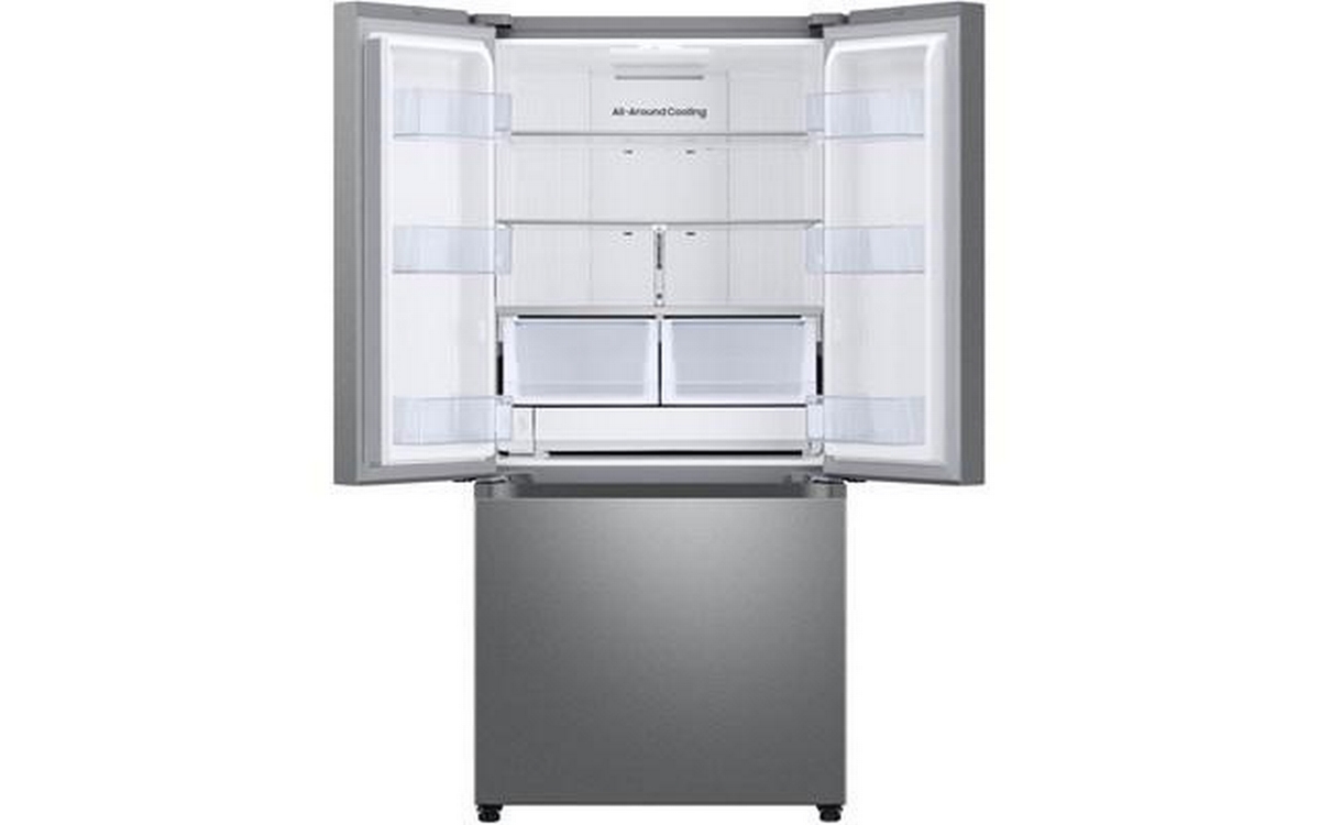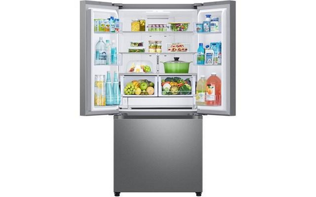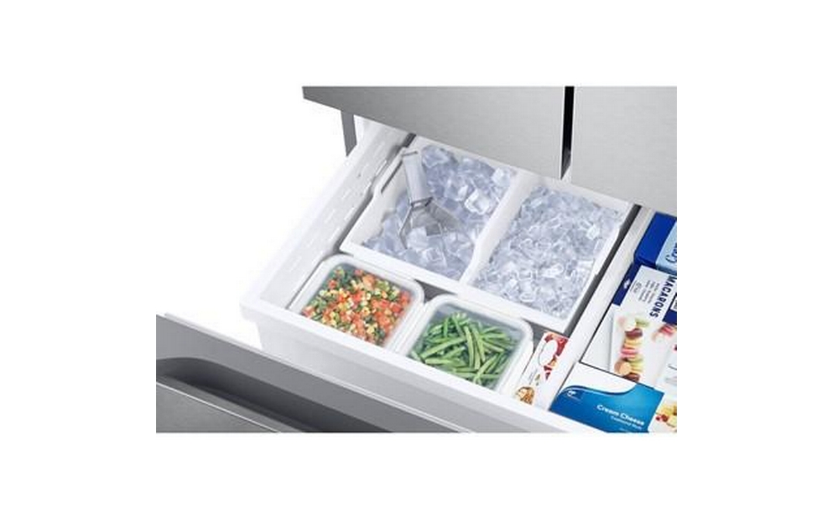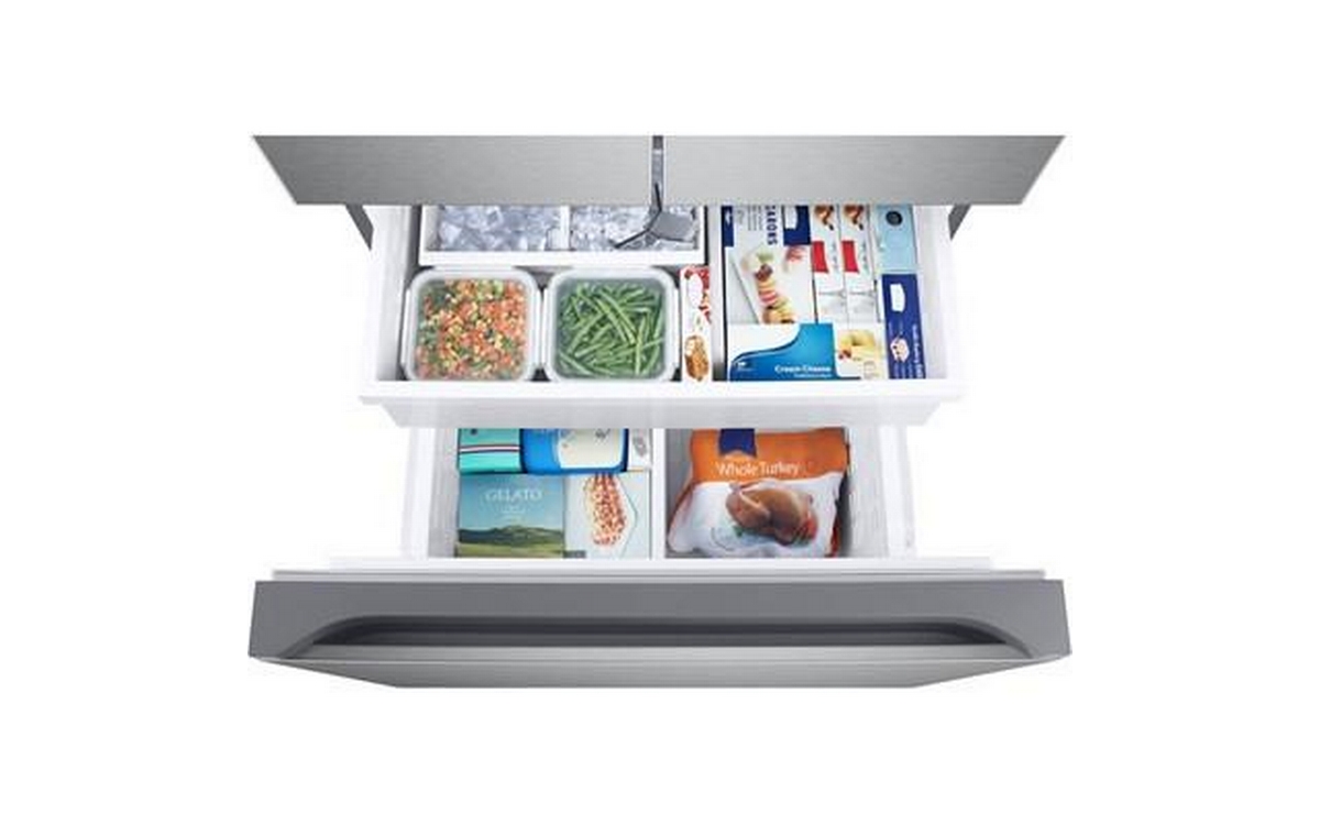 This Samsung 25 cu. ft. French 3-door refrigerator features an internal water filter, tempered glass spill-proof shelves, Wi-Fi connectivity, and dual auto ice maker with Ice Bites™.