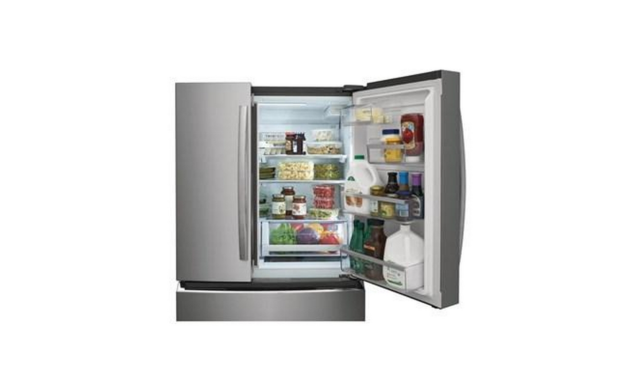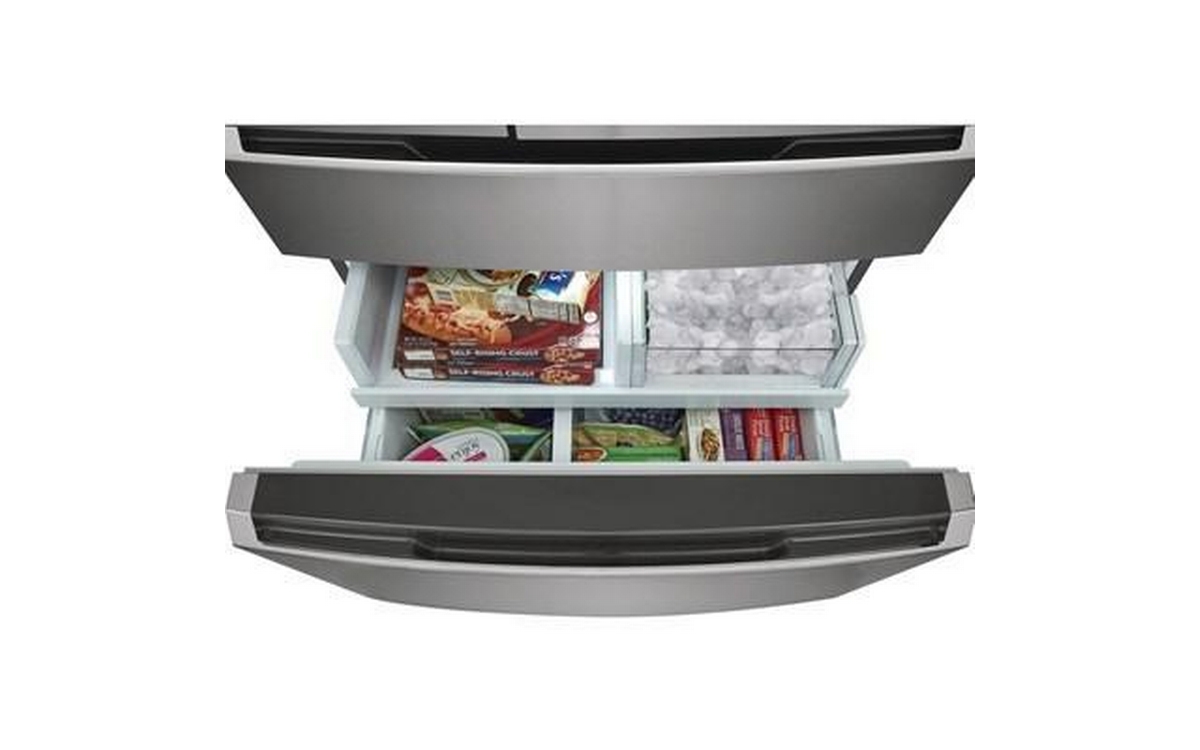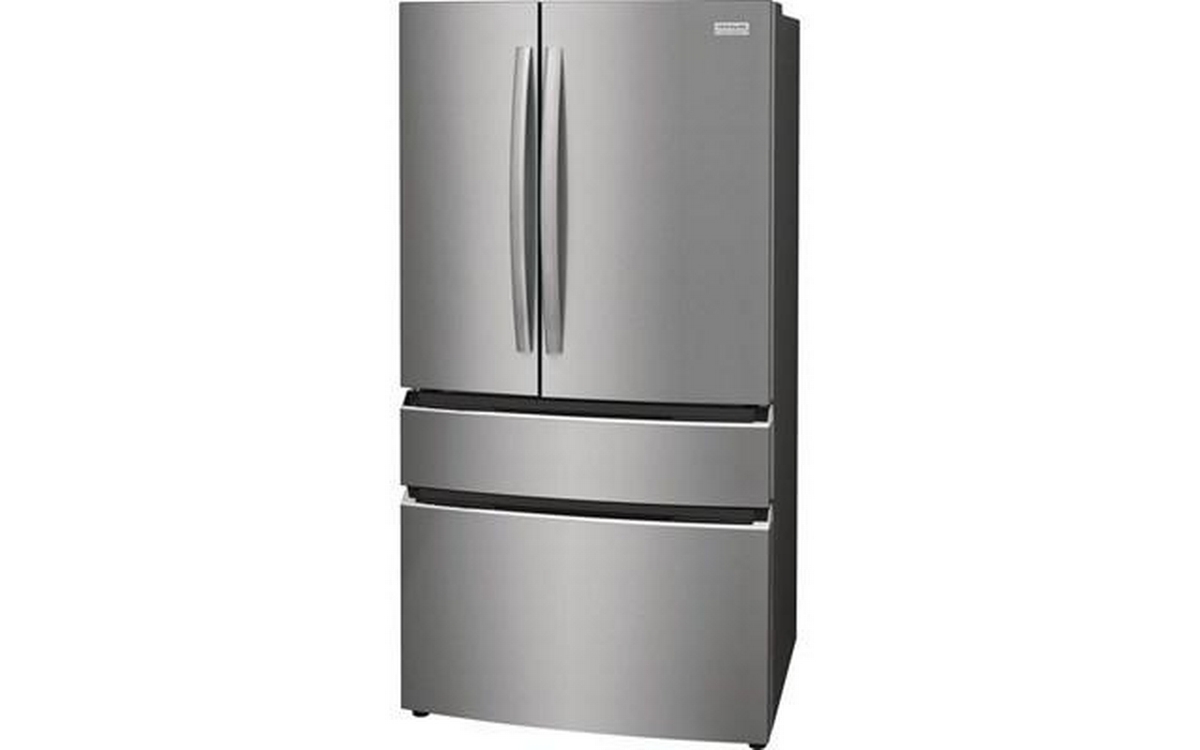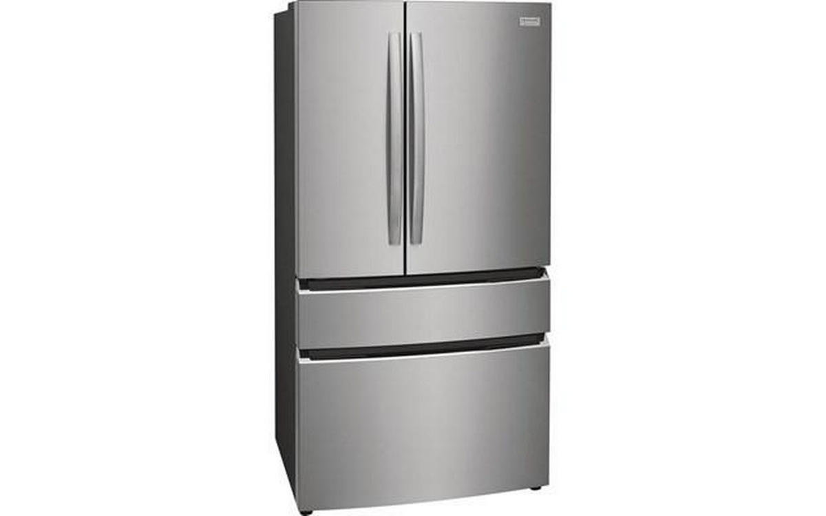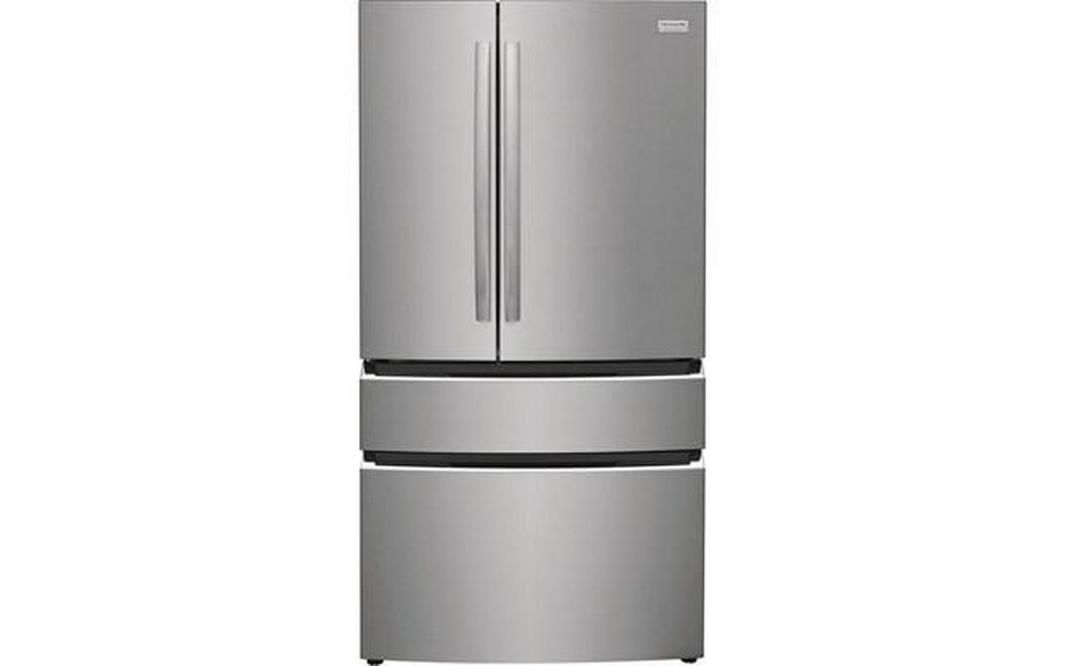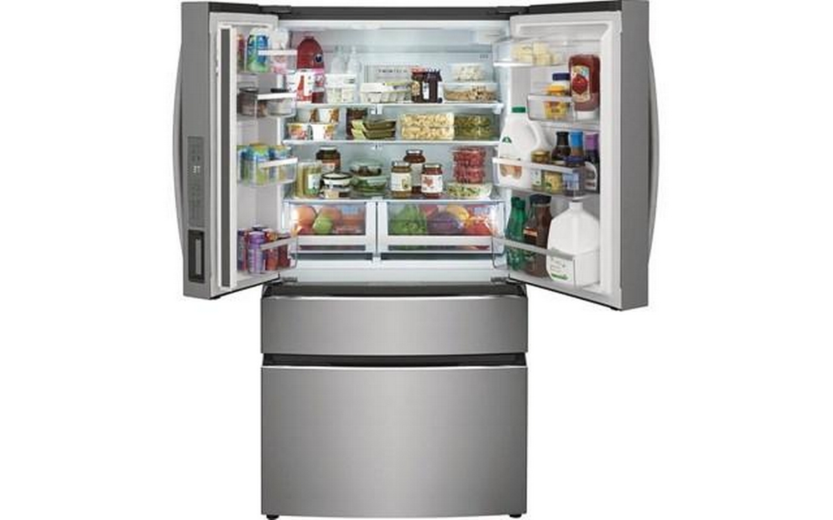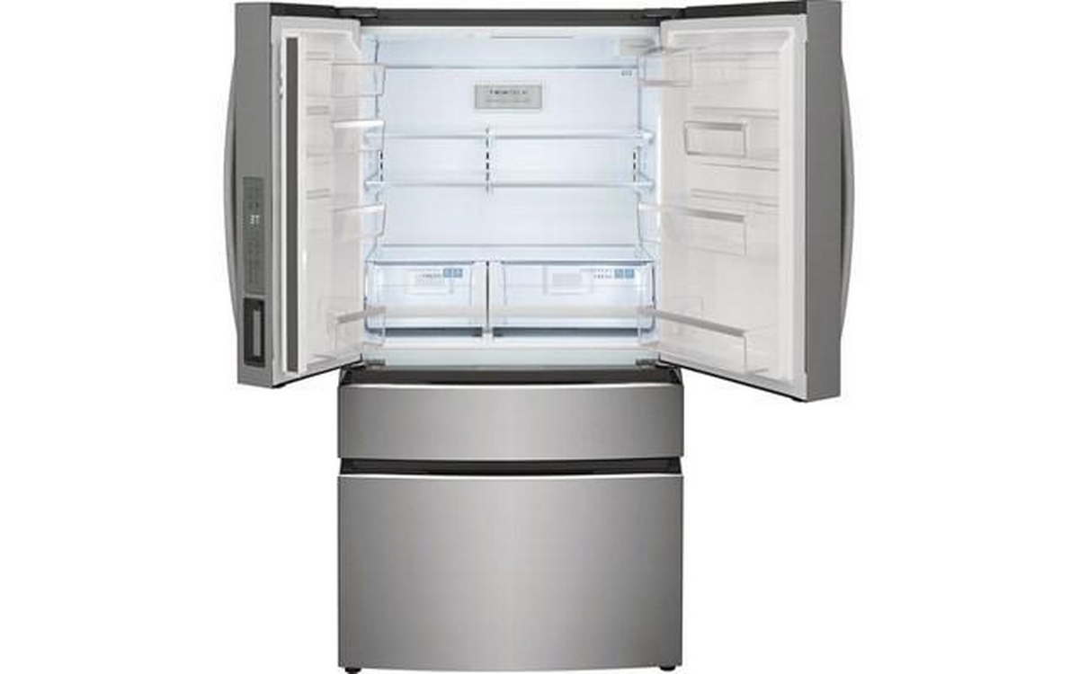 Frigidaire Gallery 4-door refrigerator features a digital temperature display, interior water dispenser and ice maker, and clear door bins.