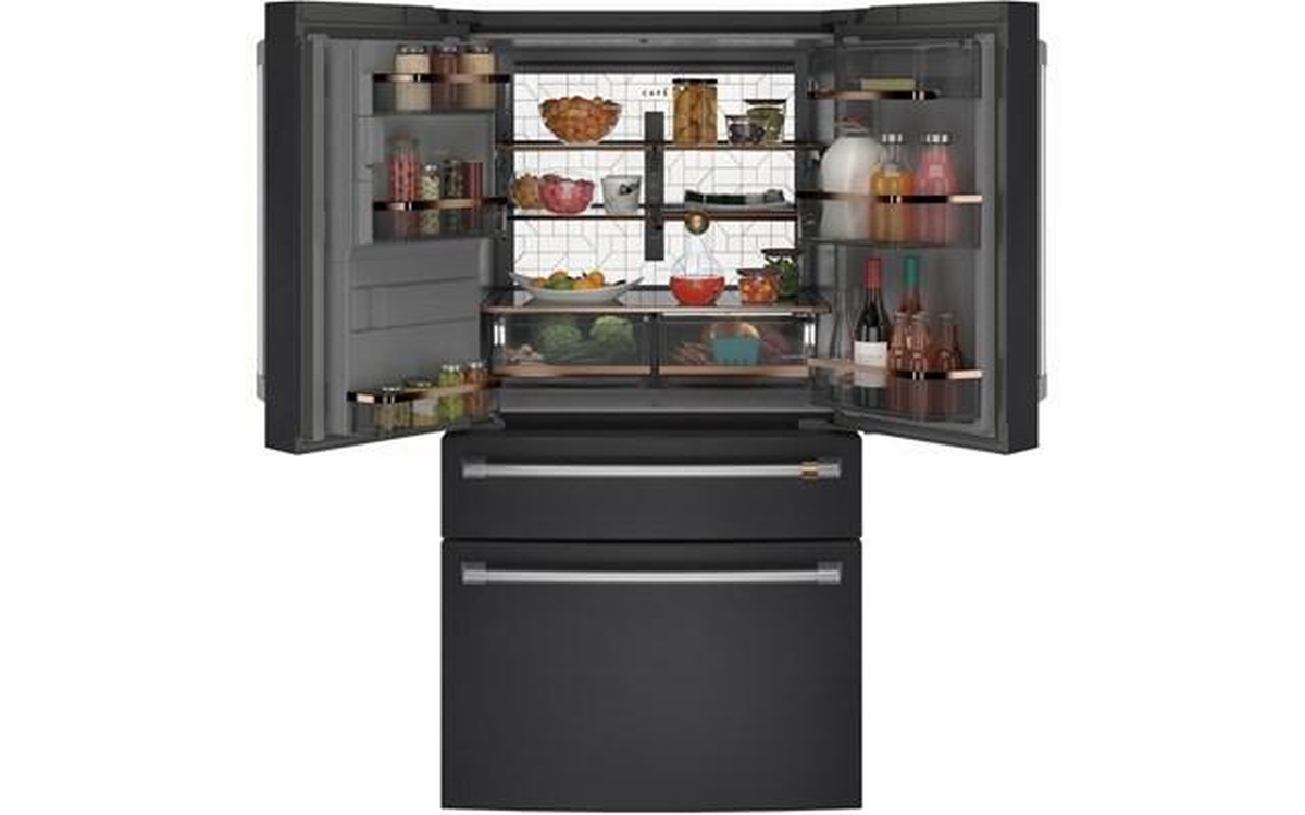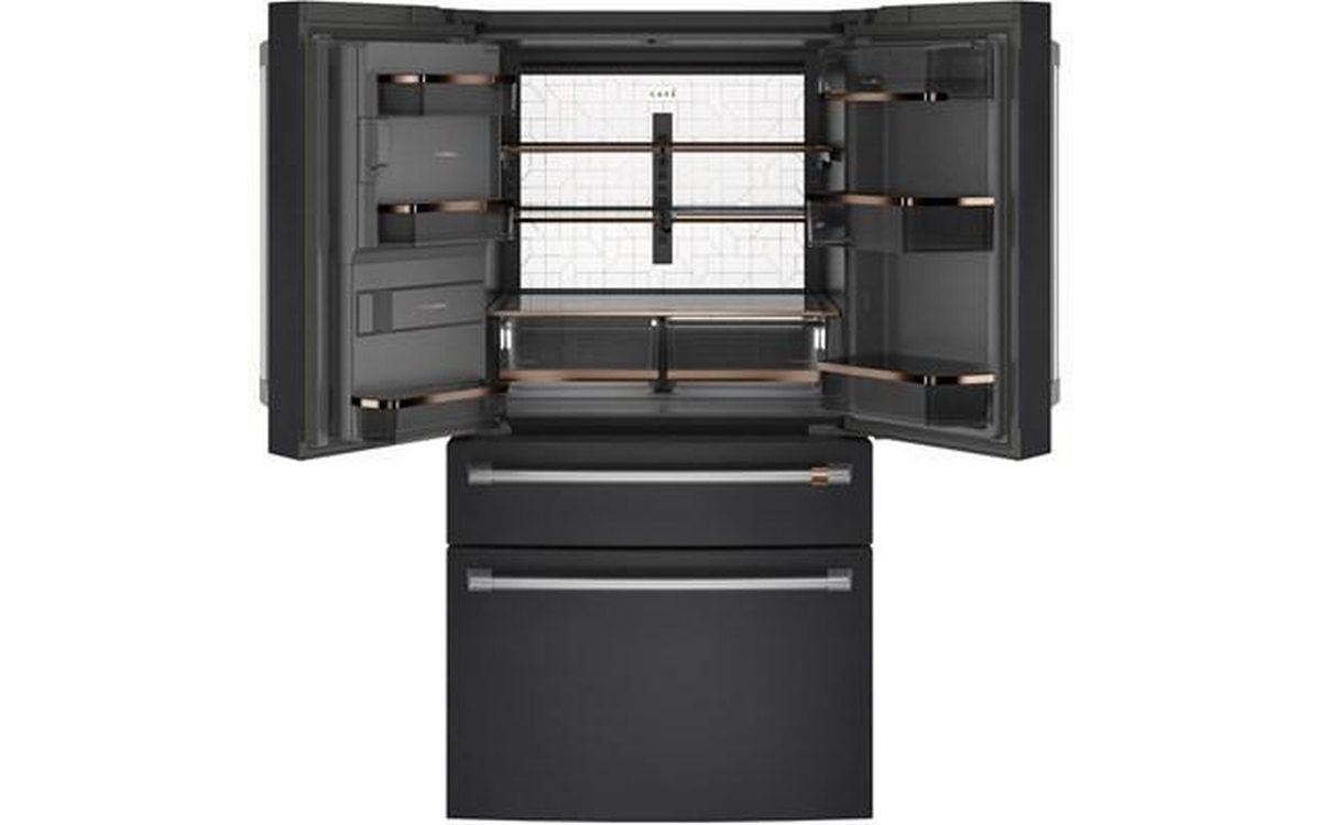 Café™ 22.3 cu.ft. smart counter-depth 4-door refrigerator. Enjoy the flexibility of a Convertible Drawer with Soft Freeze with settings as low as 23 degrees or as high as 42 degrees, and keep items organized with sliding glass dividers. Relish the bright, uniform light of an LED light wall that spans the back wall of the refrigerator, illuminating the fresh food section so every item is easy to find. Effortlessly fill containers with filtered water by simply pressing the AutoFill button which uses sensors to dispense the perfect amount every time.