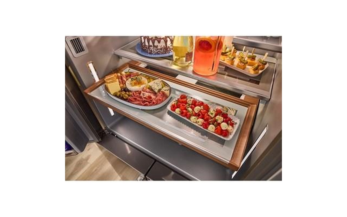 wows from the inside out with premium craftsmanship and design. Wood-look trim, metallic touchpoints, smoked crisper bins and ultra-bright LED lighting pop against the stunning silver-colored finish.