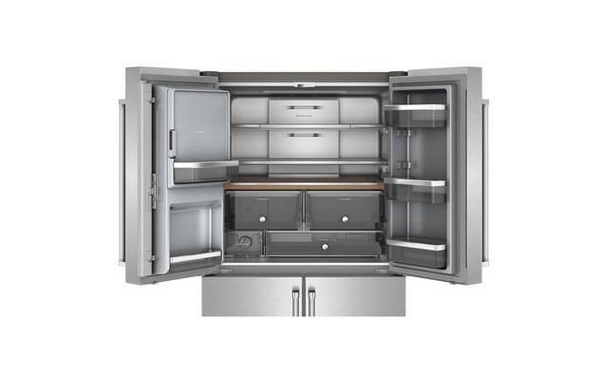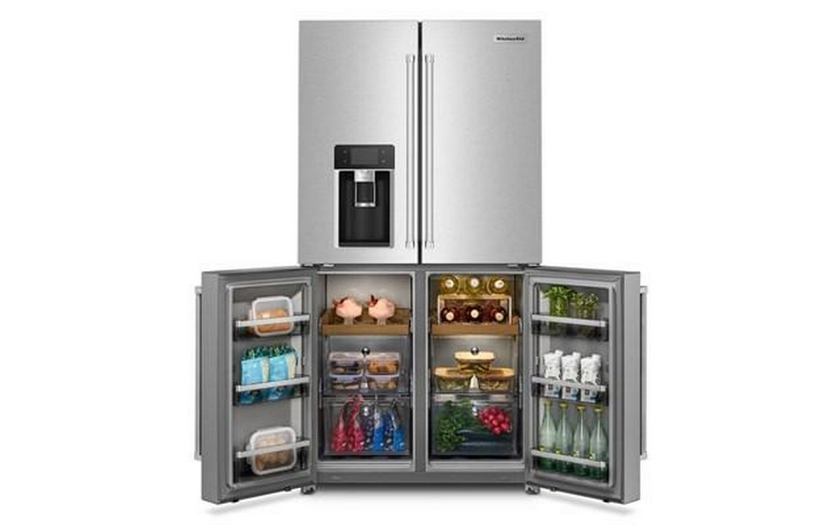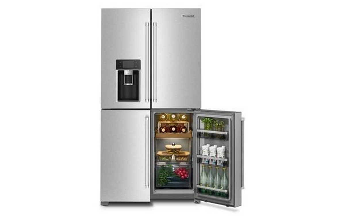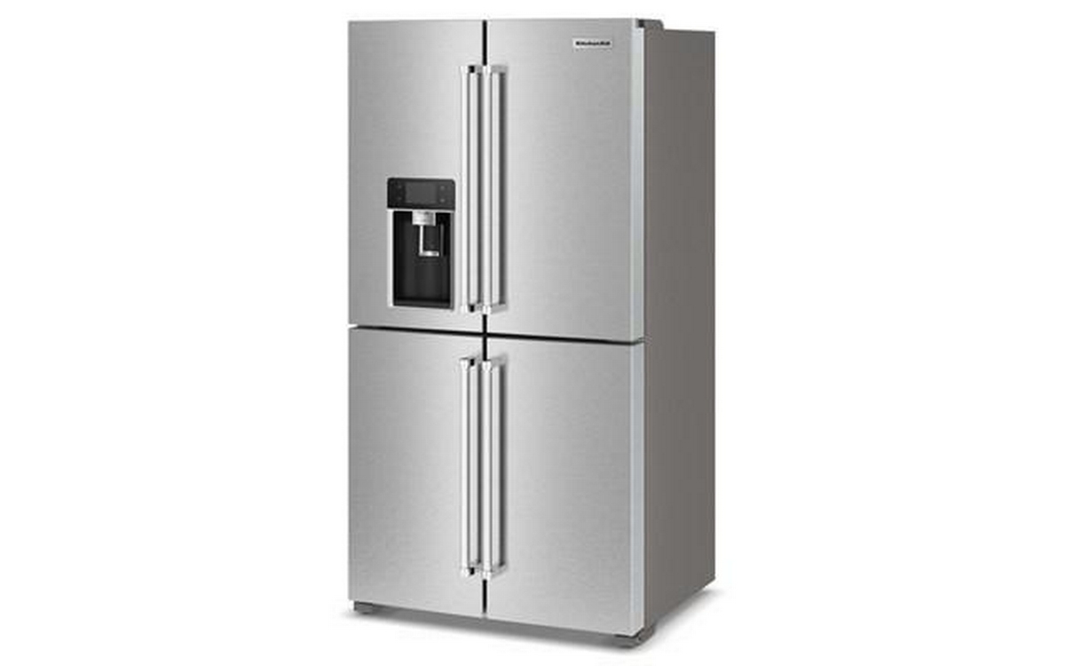 The KitchenAid 36-inch, 19.4 cu. ft. Counter-Depth French 4-Door Refrigerator offers ample storage space and modern conveniences. It features a water and ice dispensing system, ensuring easy access to fresh, filtered water and ice. The sleek design and counter-depth profile provide a seamless look in any kitchen.
