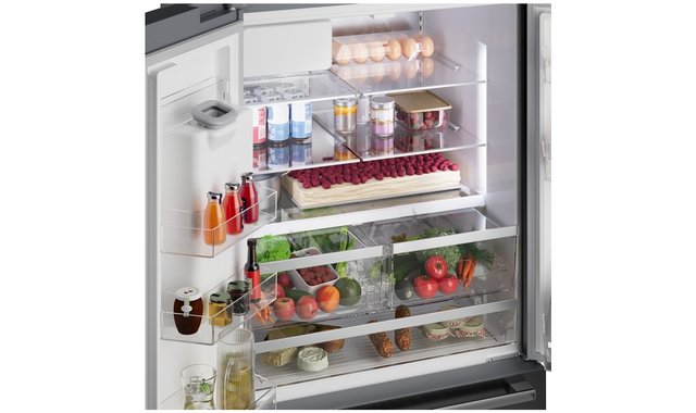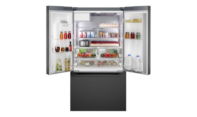 This 21.6 cu ft French door refrigerator features a true counter-depth design for a seamless kitchen fit. It offers an external filtered water and ice dispenser, delivering both crescent and crushed ice. The VitaFresh Plus™ system regulates temperature and humidity to keep produce fresher longer. With QuickIce Pro™, the fridge can produce up to 12 lbs of ice per day, and the Bottle Fill function allows for effortless hands-free refills. The UltraClarityPro™ filter ensures clean, fresh water by removing common impurities. Inside, the layout includes 4 adjustable glass shelves, 2 humidity-controlled crispers, a full-extension freezer drawer, and ample door bins including gallon-size storage. MultiAirFlow™ ensures even cooling throughout. The fingerprint-resistant black stainless finish adds modern elegance, while Wi-Fi Home Connect® allows remote access and control.