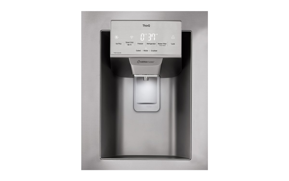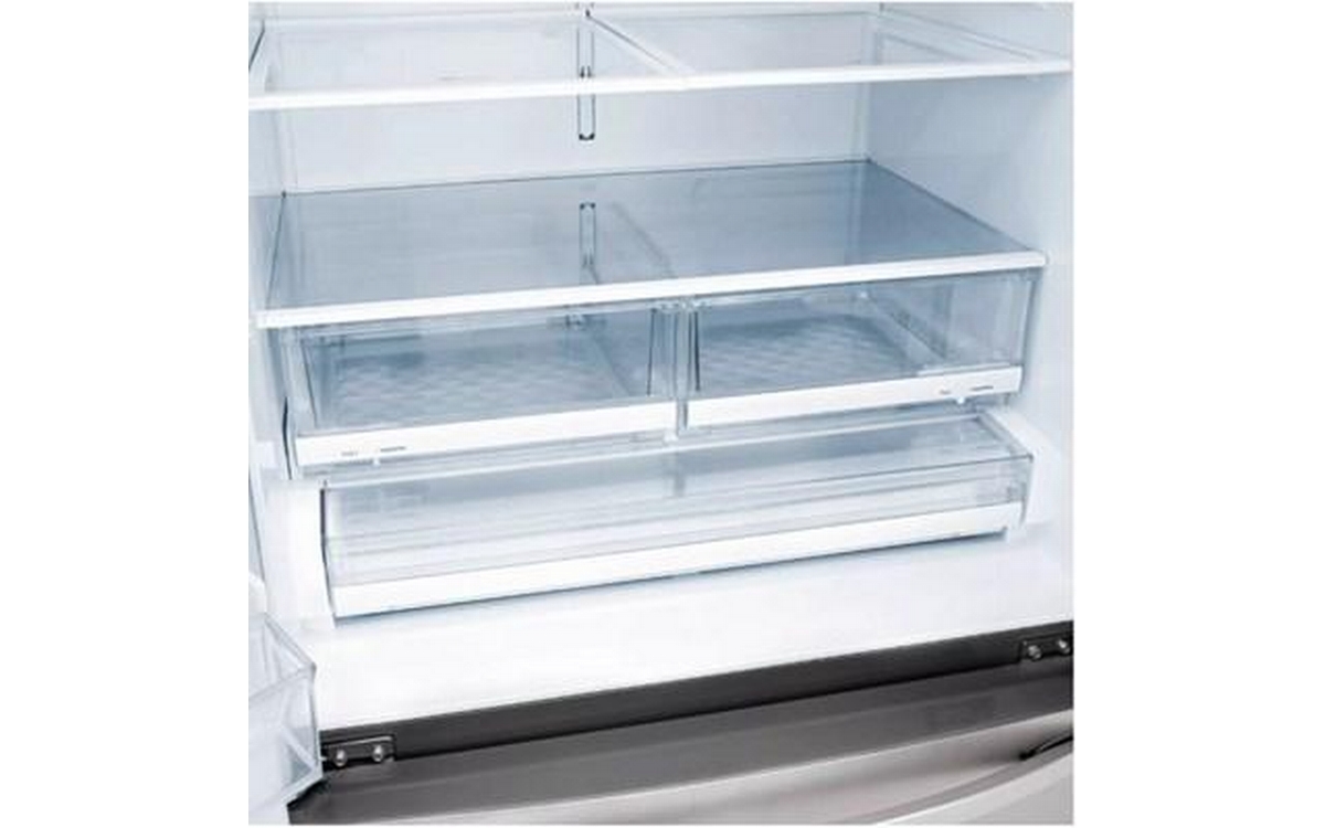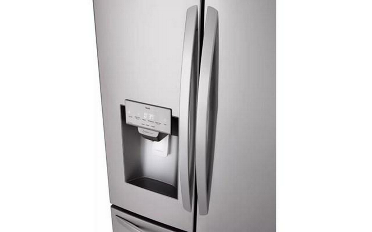The LG 28 cu. ft. 3-Door French Door Refrigerator offers generous storage and modern convenience. It features an ice and water dispenser, along with LG's Craft Ice technology, which produces slow-melting round ice for premium beverages. The spacious interior, combined with a sleek design, ensures easy access to fresh and frozen items while adding a touch of style to any kitchen.