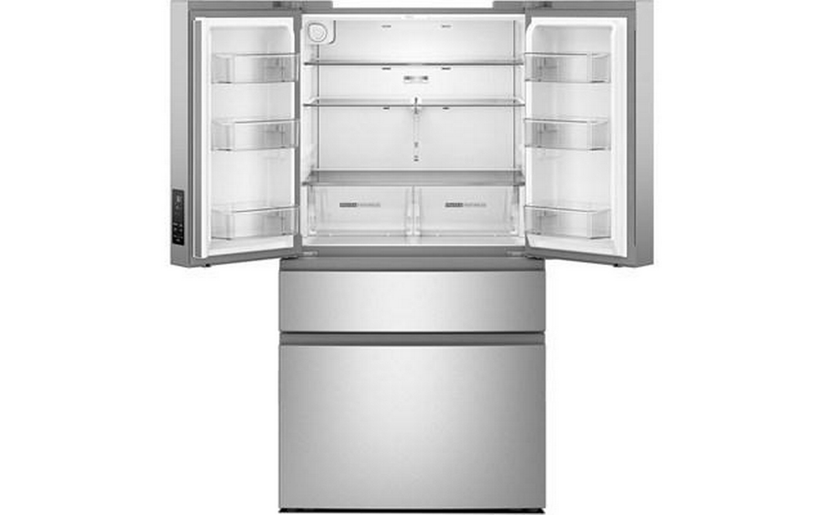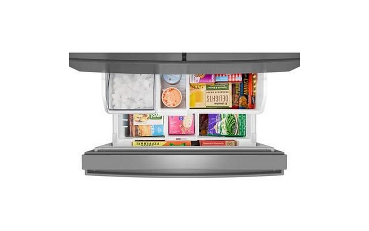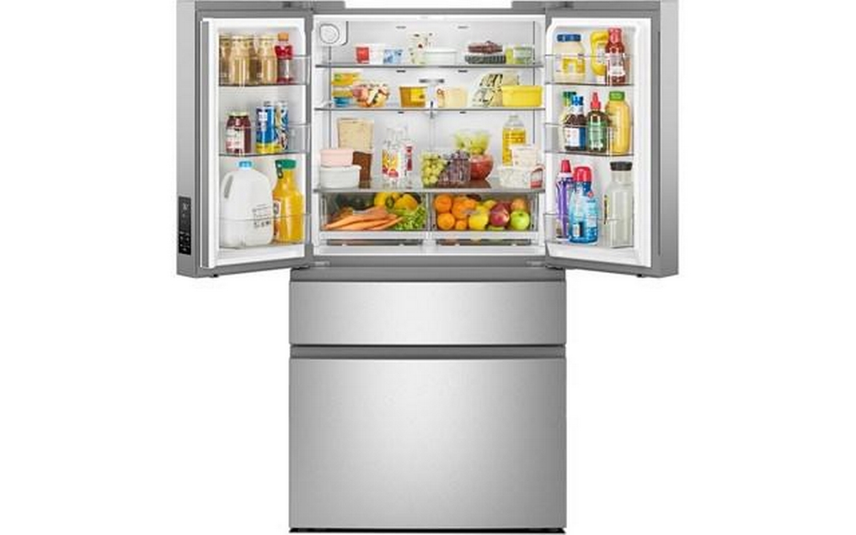 Whirlpool 36-inch french 4-door refrigerator with crisper drawers and glass shelves.