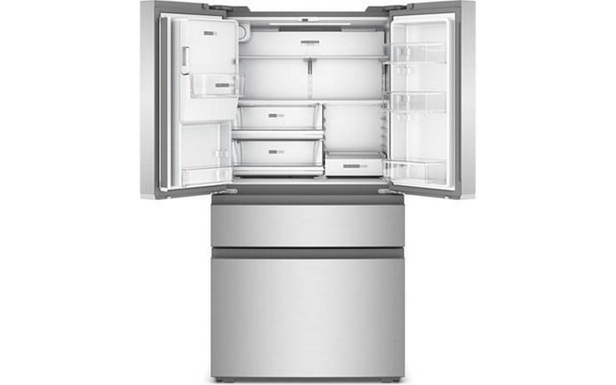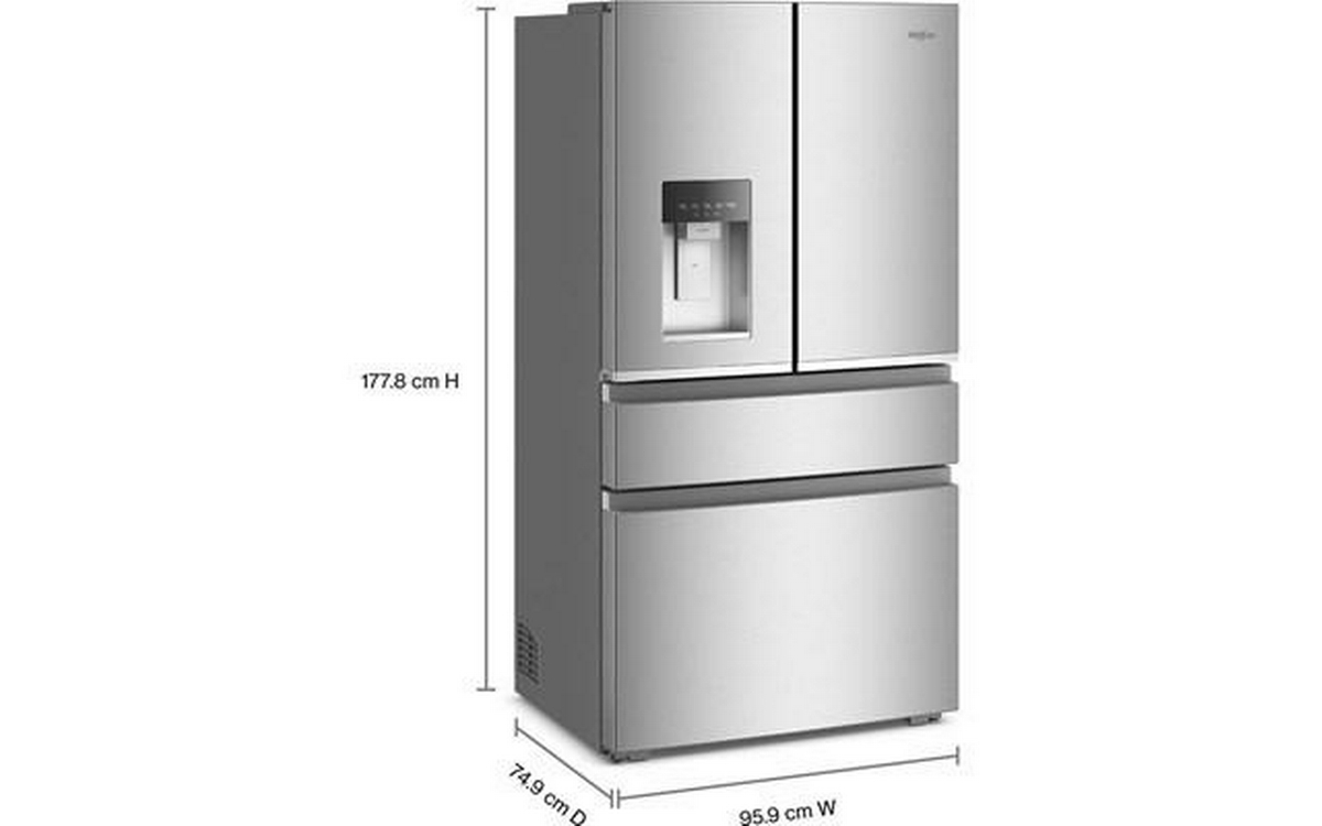 Whirlpool french 4-door refrigerator features glass shelves, clear door bins and a total capacity of 22 cu. ft.
