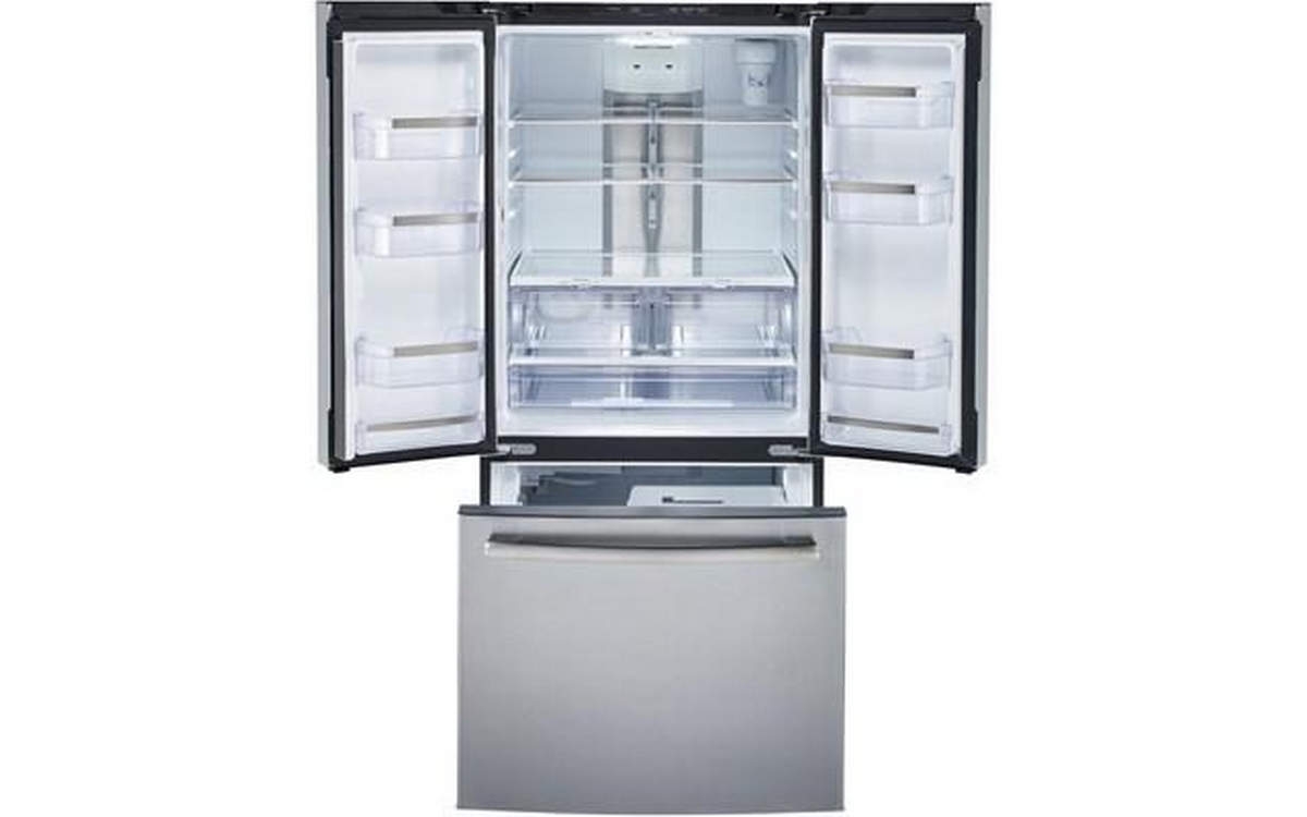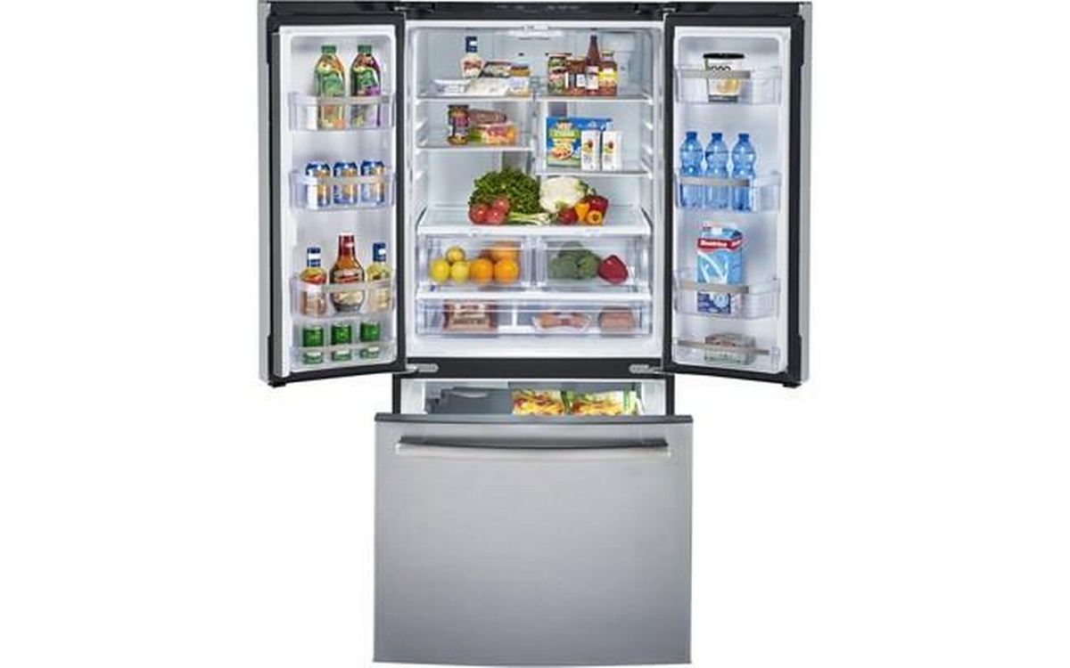 GE Profile 20.8 cu. ft. French 3-Door Refrigerator with ice maker. It features a Door Alarm, Energy Saver and the FrostGuard system.