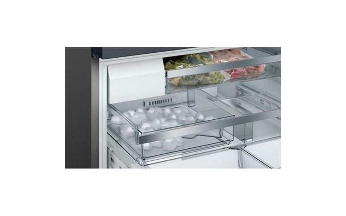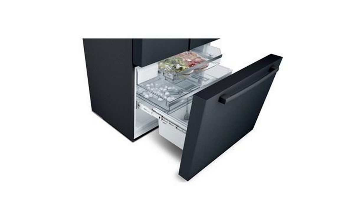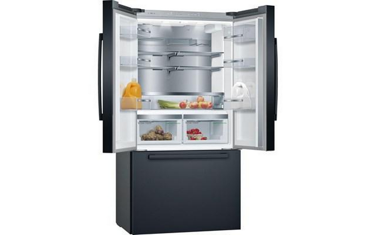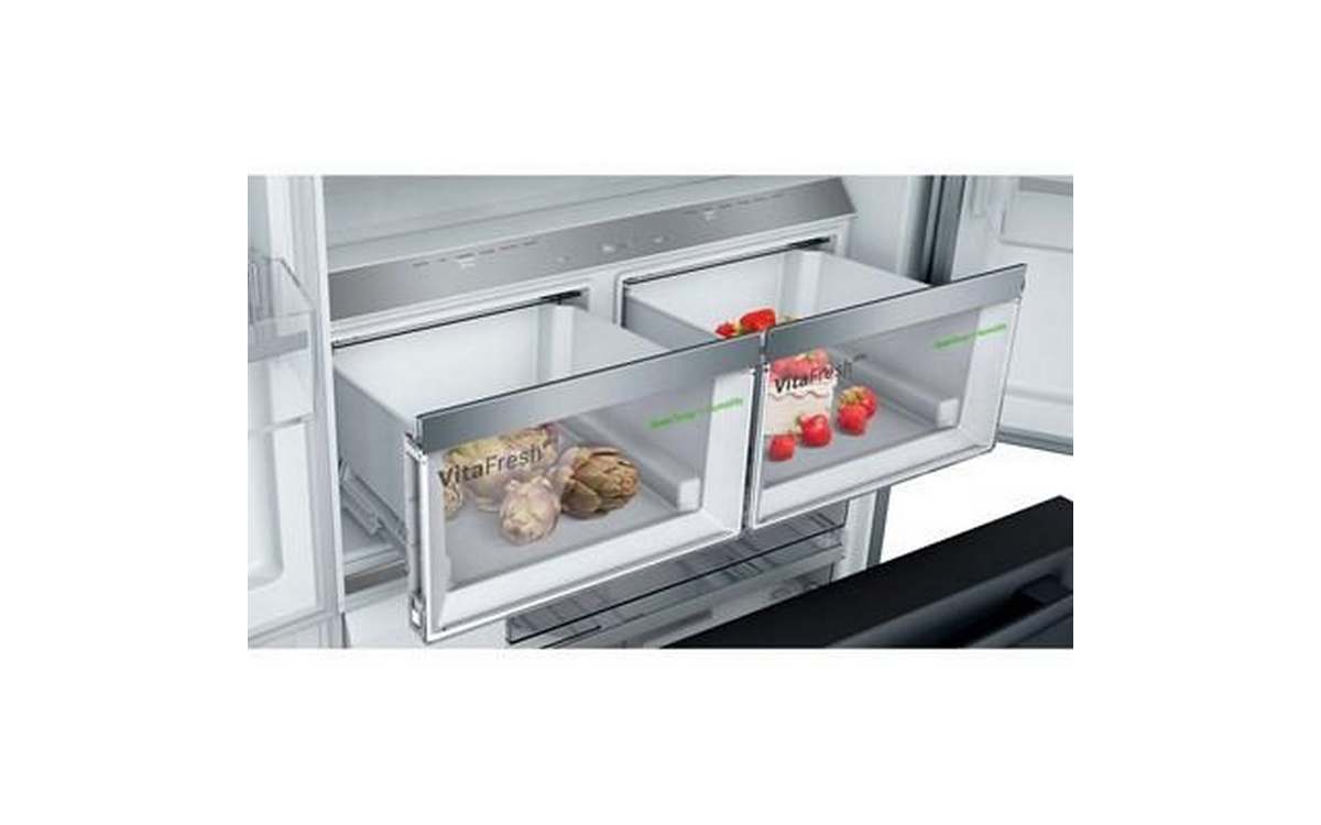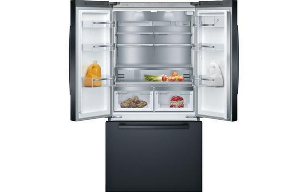 This 800 Series Bosch 36-inch 3-door refrigerator features FlexBar™ flexible storage bar, VitaFreshPro™ humidity-controlled drawer, and is equipped with an interior ice maker and water dispenser.