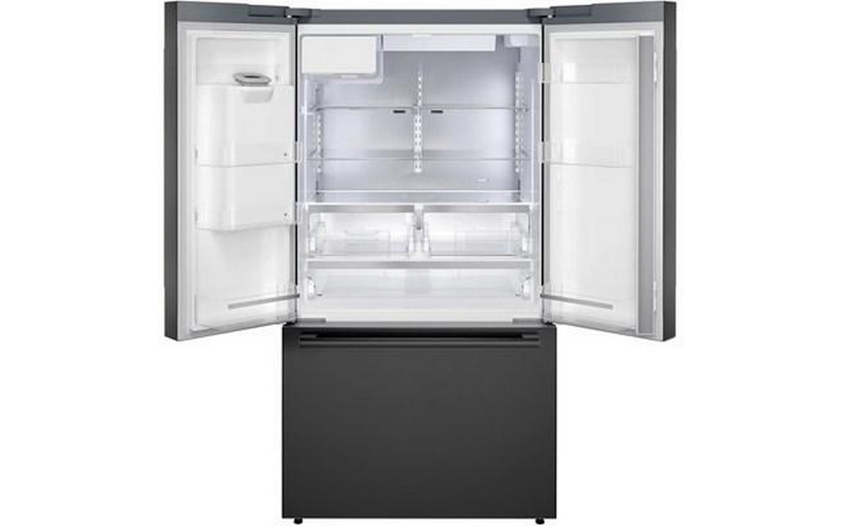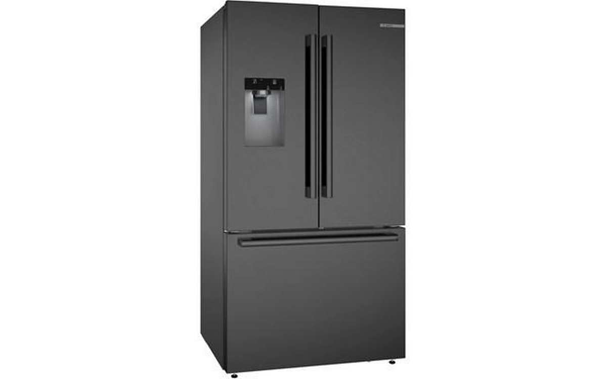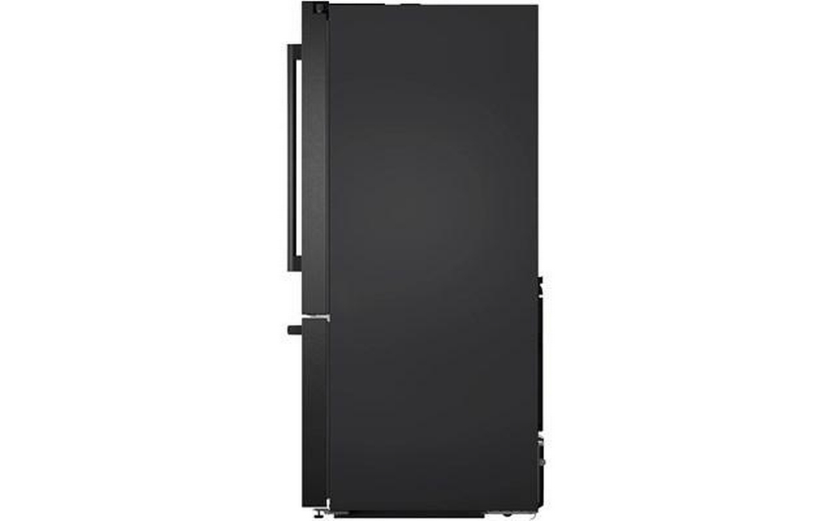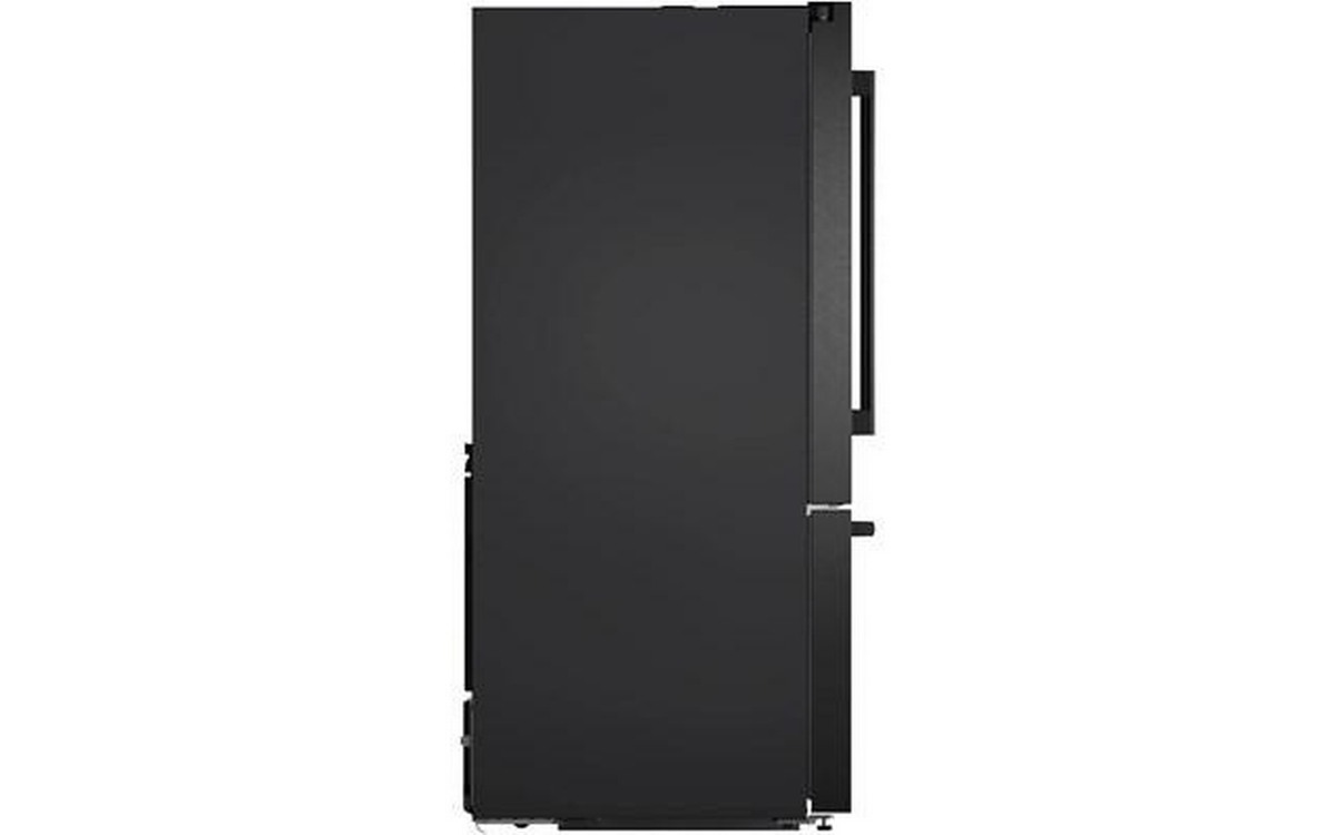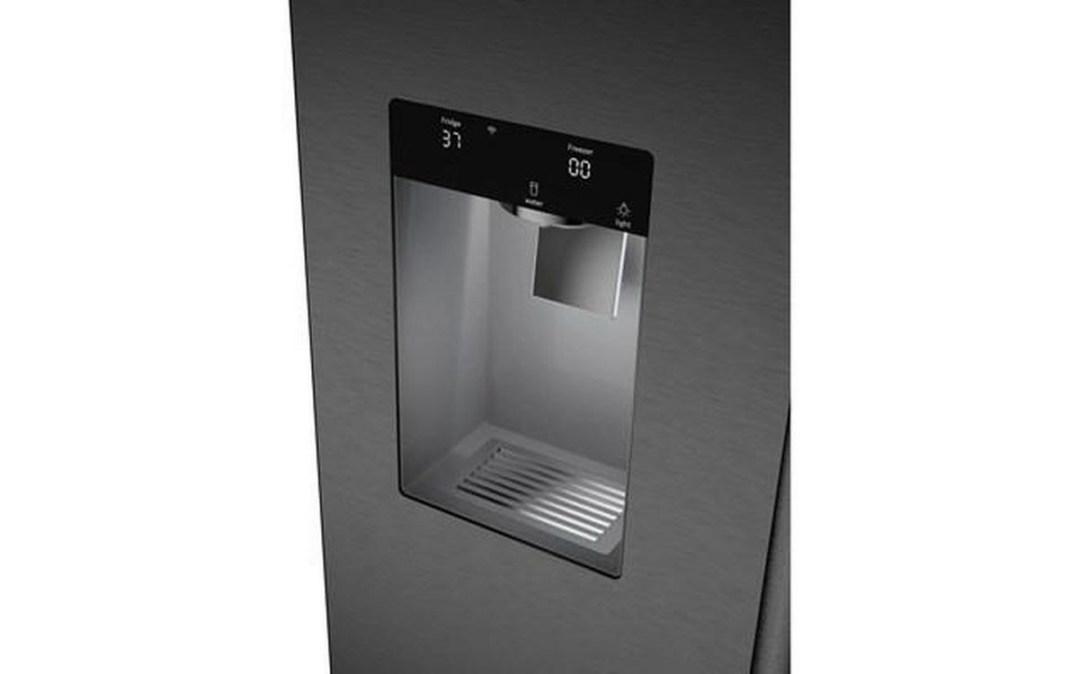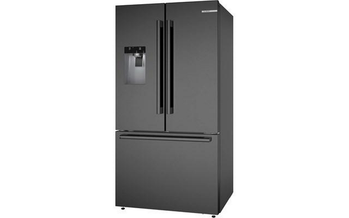 The 500 Series 36'' French Door Bottom Mount Refrigerator in brushed black steel with anti-fingerprint finish combines style and functionality. It features LED lighting for enhanced visibility, the QuickIce Pro System™ for the fastest ice production, and the UltraClarityPro® Water Filter for exceptionally clean water. The built-in ice and water dispenser with tap connection provides convenience, offering crescent-shaped ice on demand for a touch of elegance.