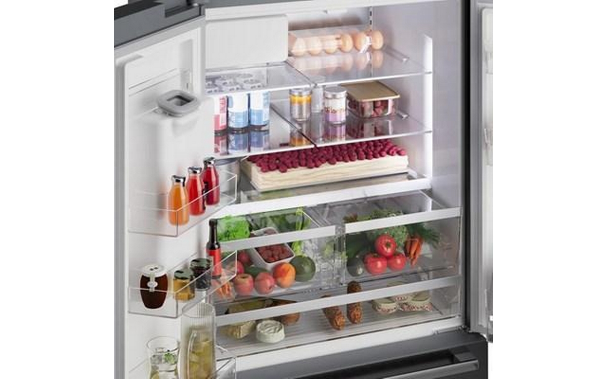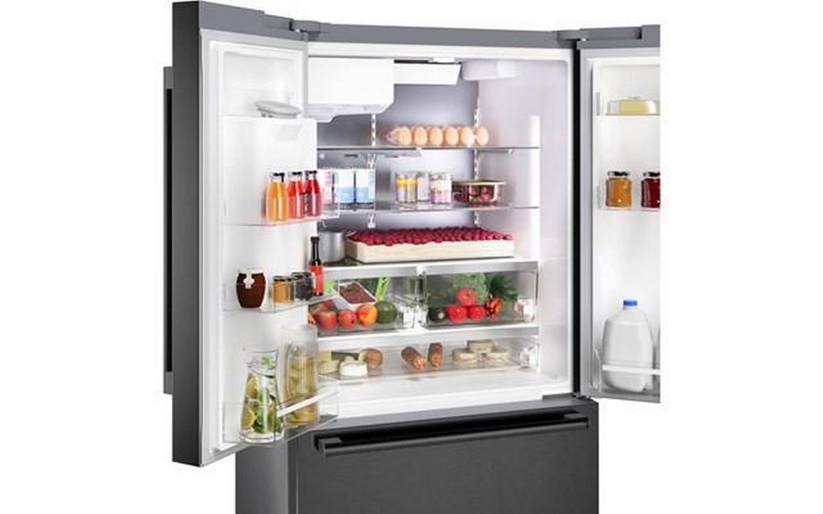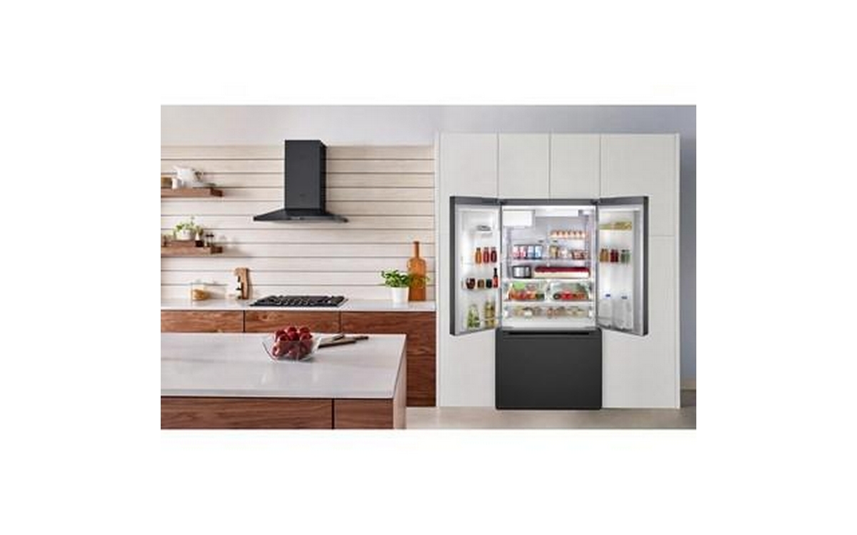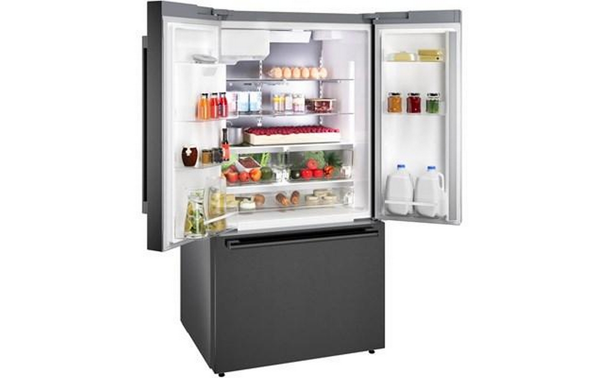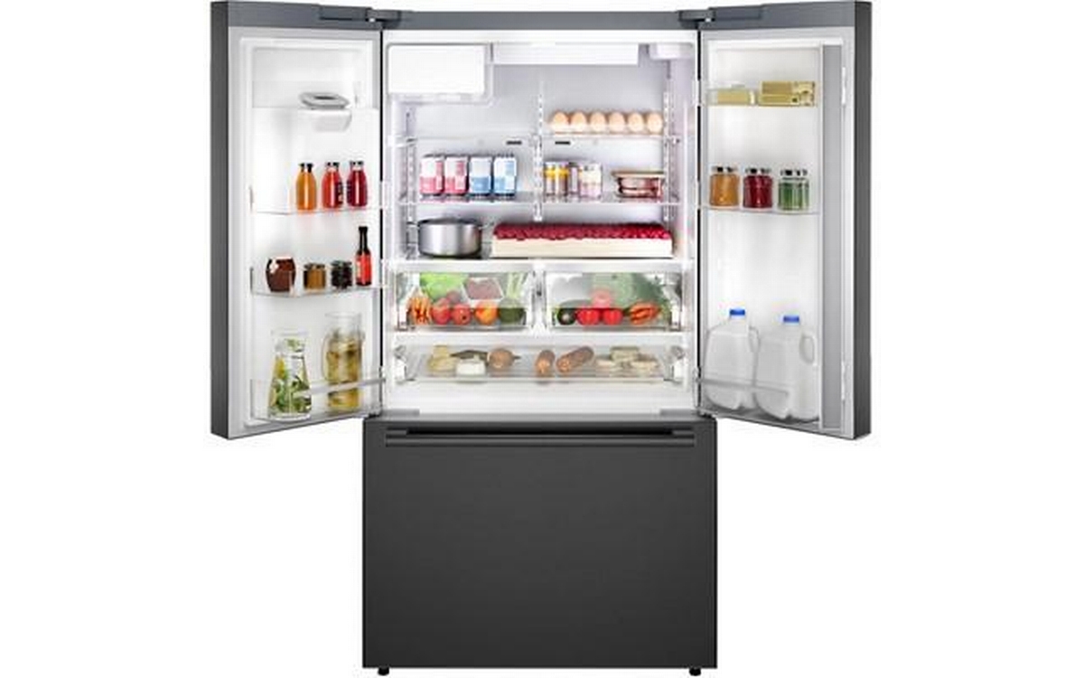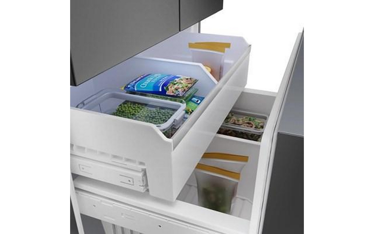 The 500 Series 36'' French Door Bottom Mount Refrigerator in brushed black steel with anti-fingerprint finish combines style and functionality. It features LED lighting for enhanced visibility, the QuickIce Pro System™ for the fastest ice production, and the UltraClarityPro® Water Filter for exceptionally clean water. The built-in ice and water dispenser with tap connection provides convenience, offering crescent-shaped ice on demand for a touch of elegance.