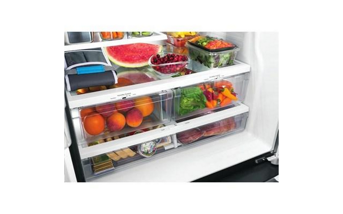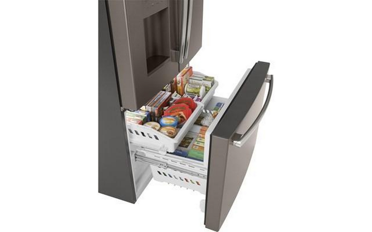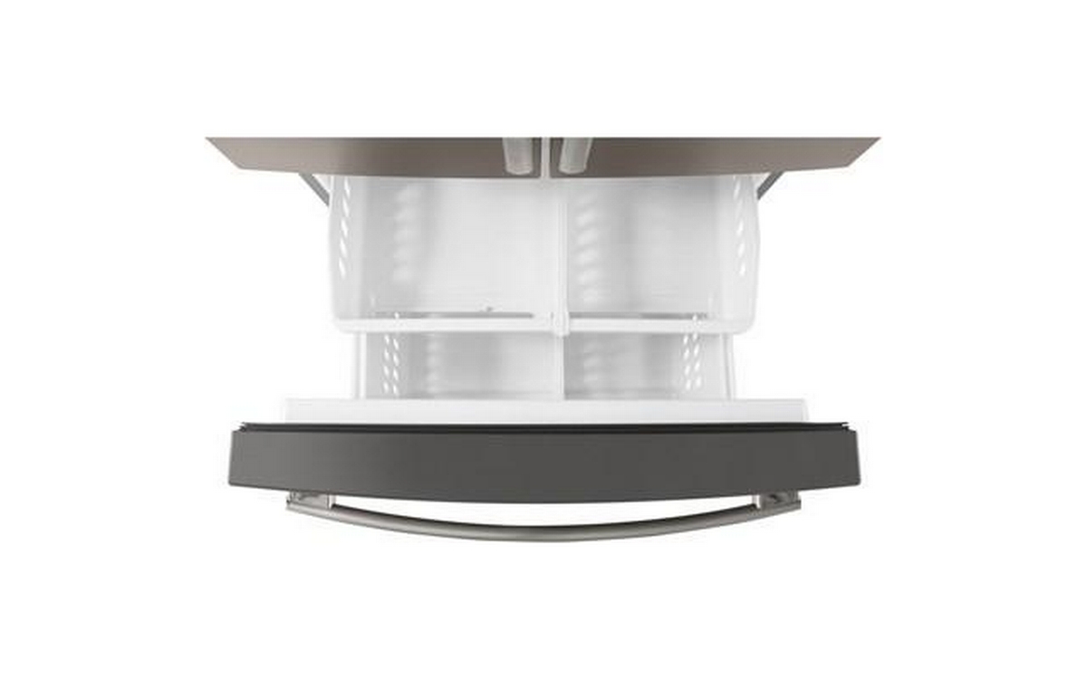 This GE 25.5 cu. ft. french-door refrigerator with bottom freezer features door alarm, an ice maker, the Multiflow Air System, water filtration and LCD controls. It's also equipped with a Quick Space shelf for added storage, Spill-proof shelves that provide easy cleanup and LED lighting that provides crisp, clear lighting.