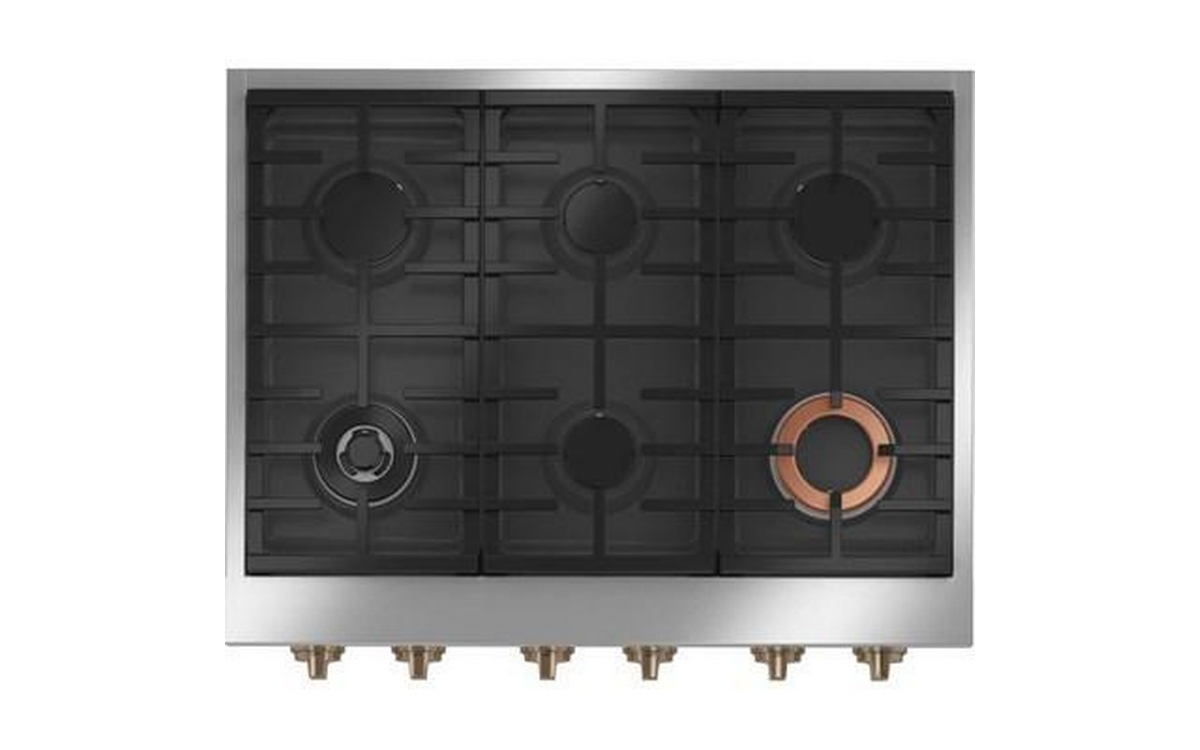 Café 36-inch wide gas rangetop with 6 burners. The versatile cooktop on this commercial-style rangetop features an entire arsenal of burners that give you the right amount of heat and control to perfectly cook anything from delicate sauces to expertly seared meats.