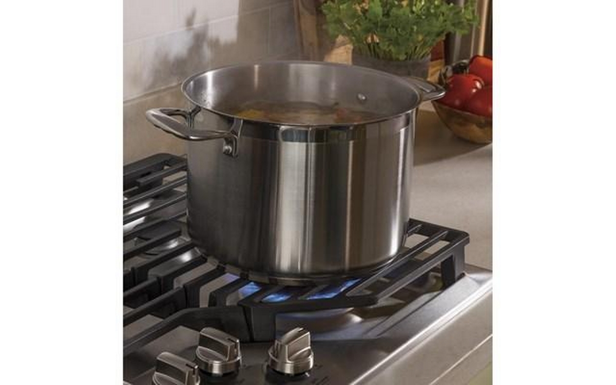GE® 36" built-in gas cooktop featuring an 18,000 BTU Power Boil burner, a Precise Simmer burner and heavy-duty, dishwasher safe grates.