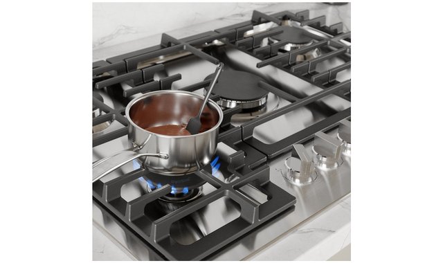 This Bosch 500 Series 36" gas cooktop features five high-efficiency burners, including a wide OptiSim® burner for even heat distribution—perfect for precision simmering. The continuous cast-iron grates enable effortless pan movement and dishwasher-safe cleaning, while the one-piece stainless steel surface ensures easy maintenance. Red LED indicator lights clearly display burner status for added safety.