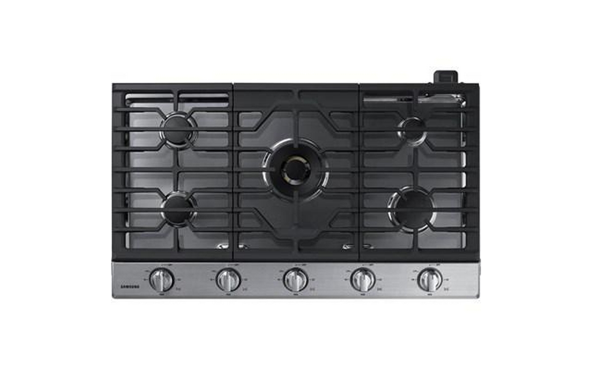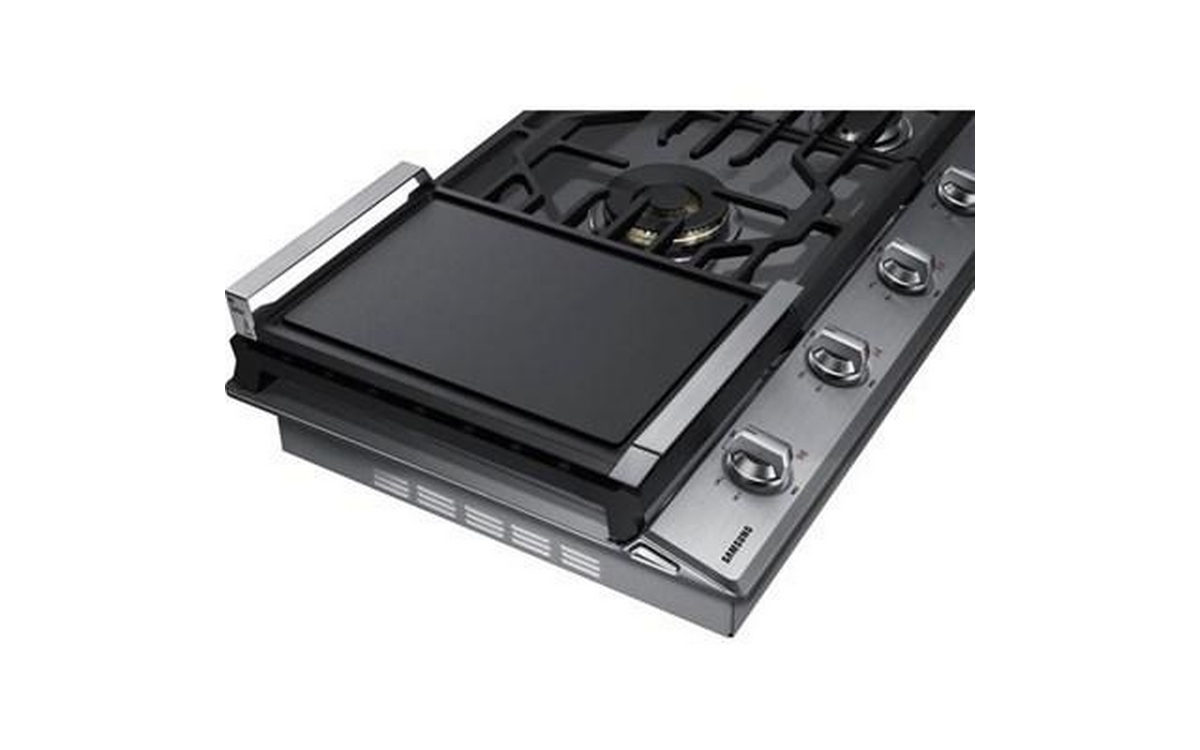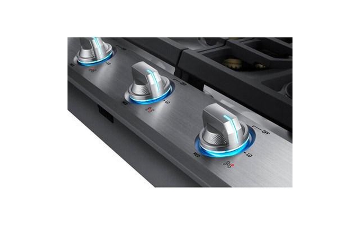 This Samsung 36-inch gas cooktop features 5 sealed burners, blue LED illuminated knobs, a griddle, and a Wi-Fi and Bluetooth connectivity.