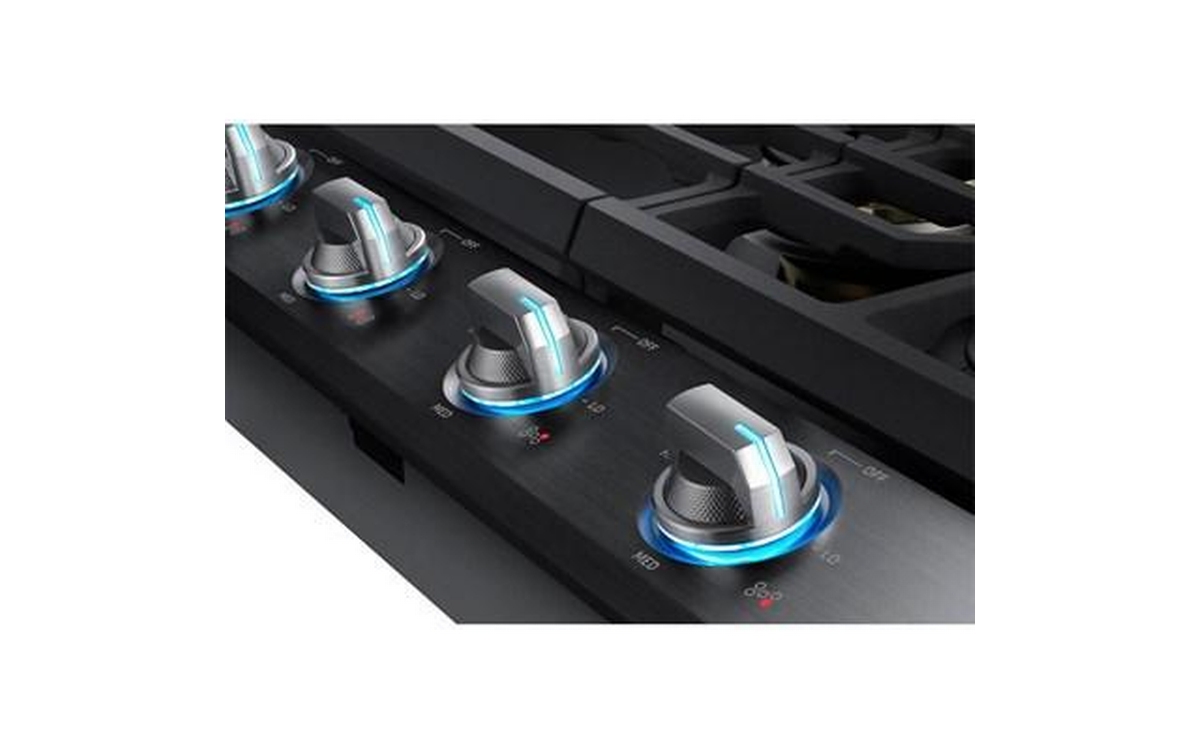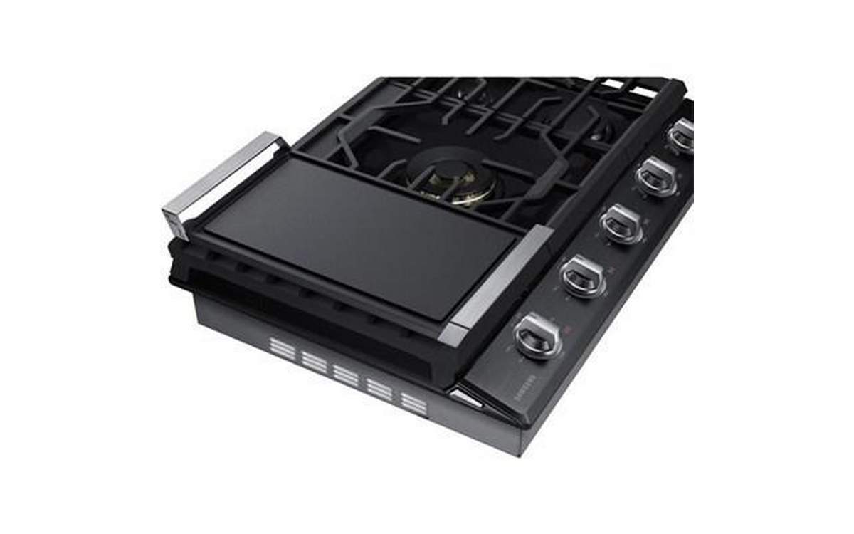 Samsung 30" gas cooktop with a 22K BTU True dual power burner that offers two heat options to quickly boil water or maintain a simmer. It features distinctive blue LED illuminated knobs that illuminate when the cooktop is in use, and a Wi-Fi and Bluetooth Connectivity to monitor and control your cooktop from anywhere. Includes a griddle.