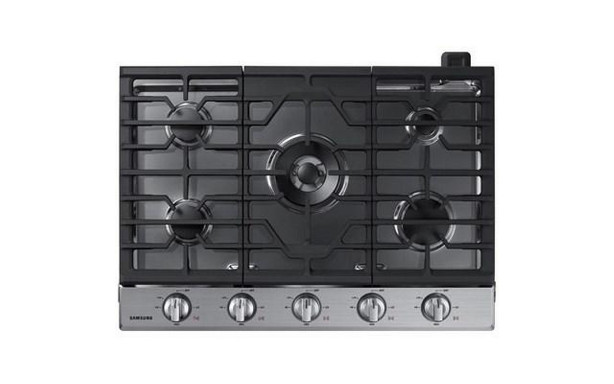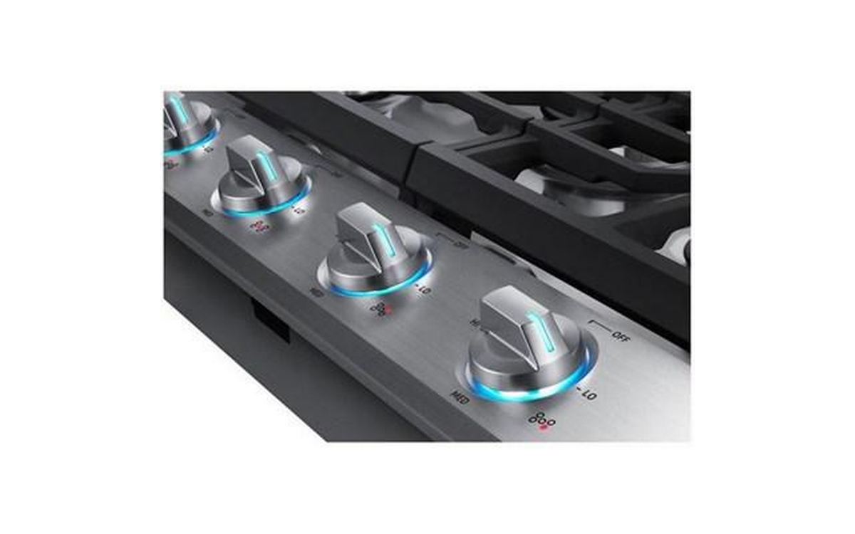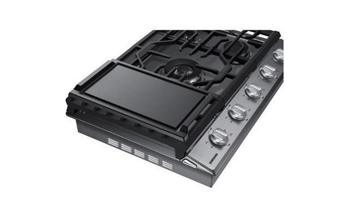 Samsung 30" gas cooktop with a 19K BTU power burner that offers two heat options to quickly boil water or maintain a simmer. It features distinctive blue LED illuminated knobs that illuminate when the cooktop is in use, and a Wi-Fi Connectivity to monitor and control your cooktop from anywhere. Includes a griddle.