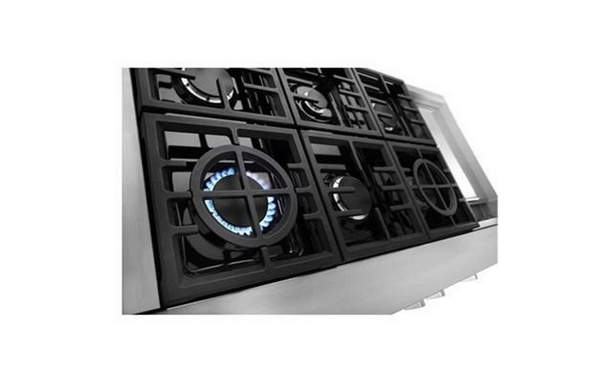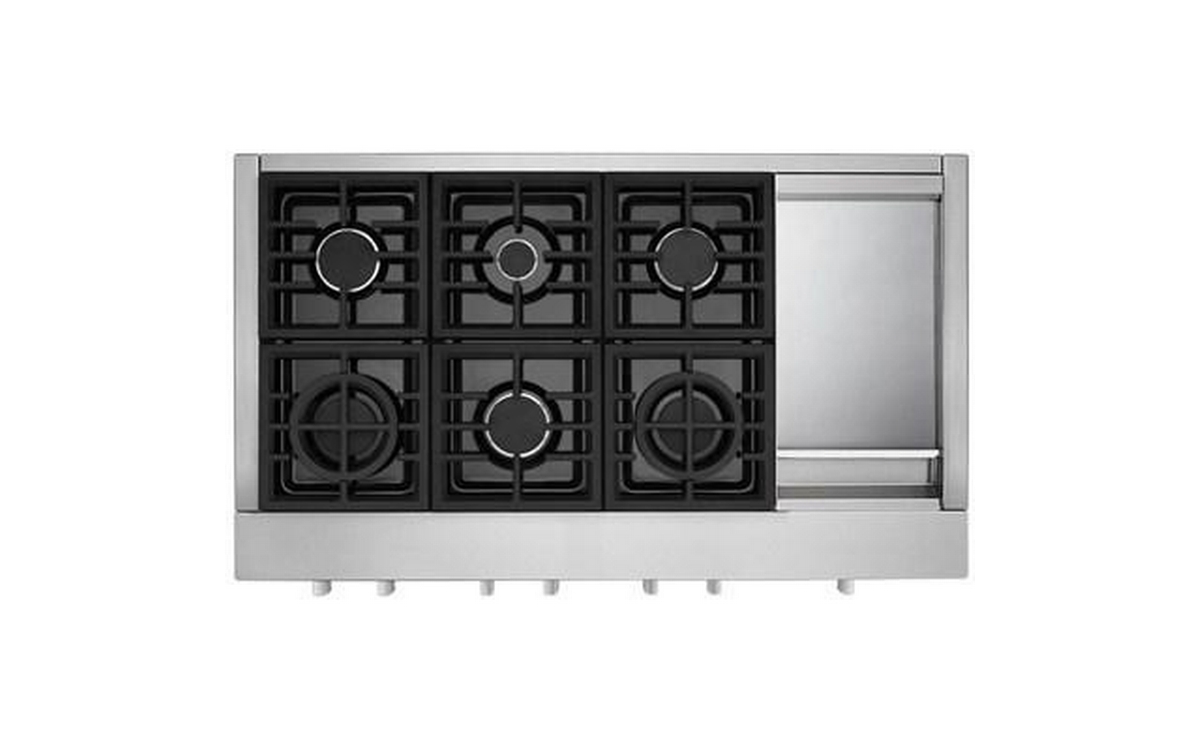 Satisfy your craving to create with a 48-inch KitchenAid® Commercial Style Rangetop with 6 burners. This gas cooktop expands your cooking capabilities with features like the Chrome Electric Griddle, two versatile 20,000 BTU Ultra Power™ Dual-Flame Burners, a 5,000 BTU Simmer & Melt Burner perfect for small saucepans and three 15,000 BTU burners.