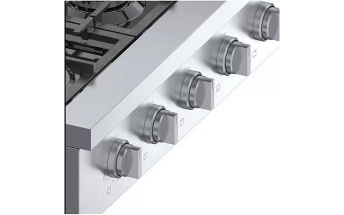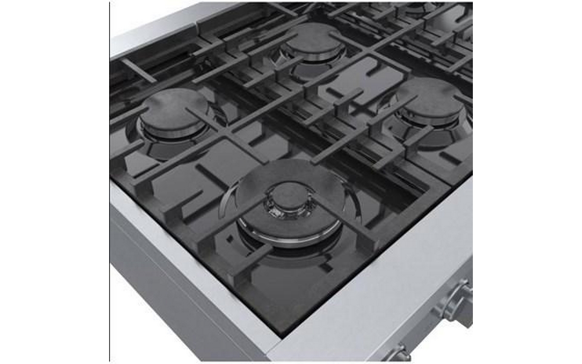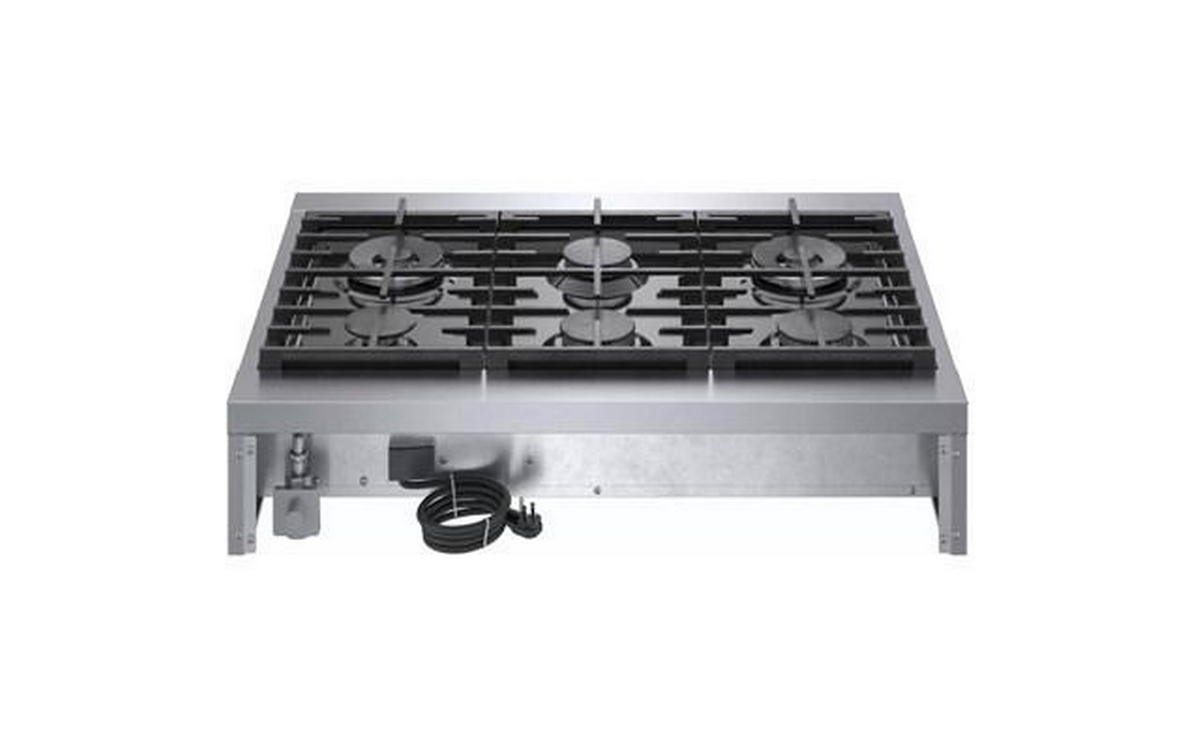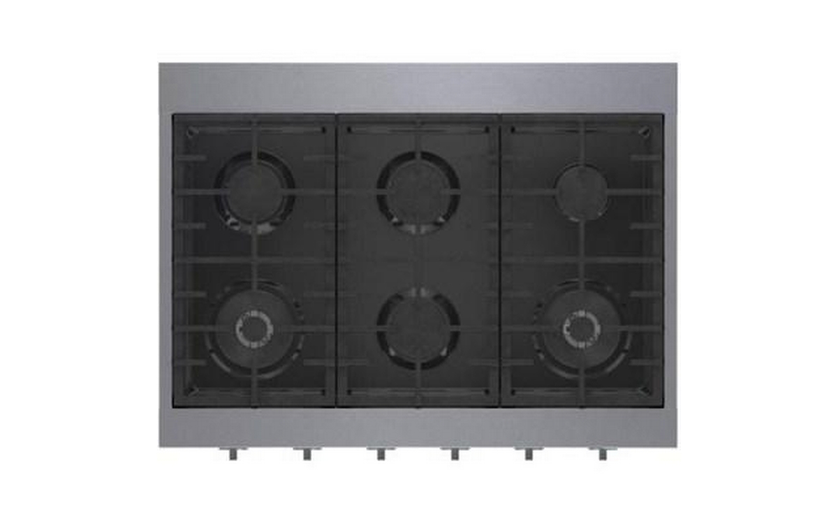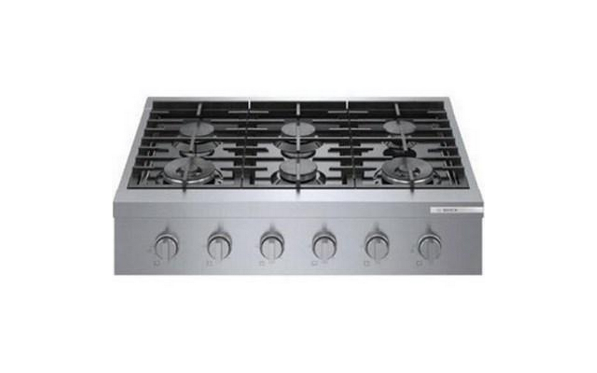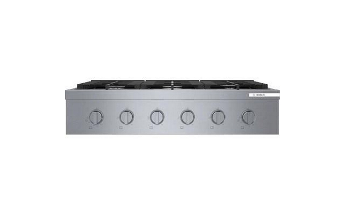This 36-inch wide Bosch slide-in gas rangetop features OptiSim® burner, cast-iron grates, electric ignition system and 6 sealed burners.