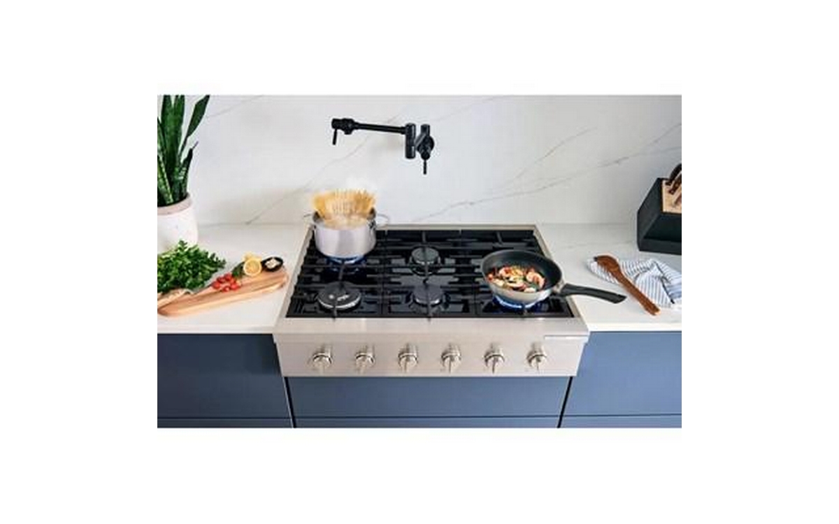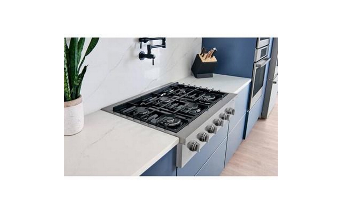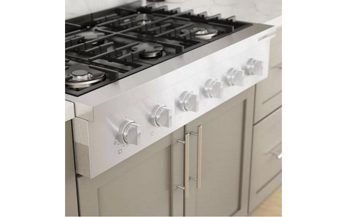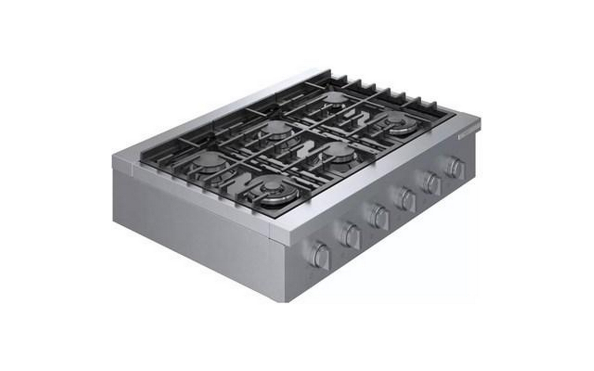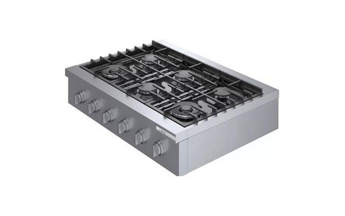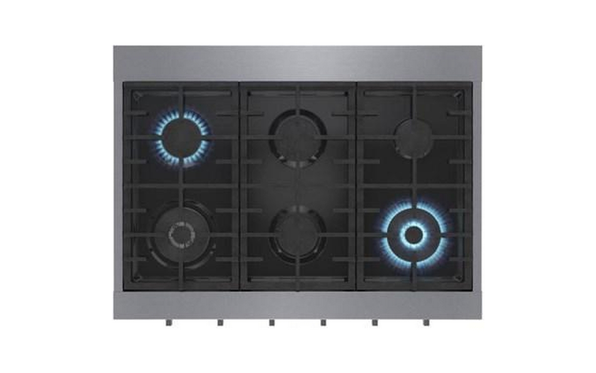 This 36-inch wide Bosch slide-in gas rangetop features OptiSim® burner, cast-iron grates, electric ignition system and 6 sealed burners.