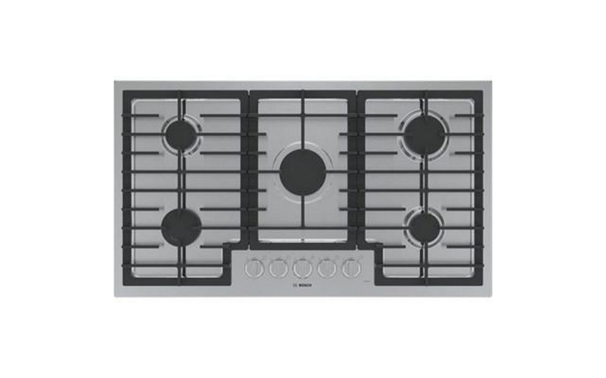 This Bosch 36-inch built-in gas cooktop features 5 sealed burners, sword metal knobs, and 3 cast iron pan supports.