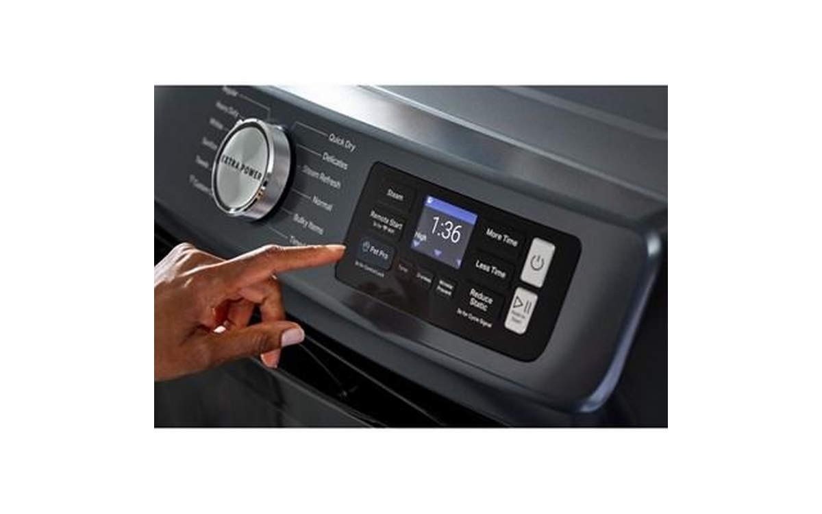 The Maytag® Pet Pro dryer traps and removes loads of pet hair from clothes. The Pet Pro option lifts and captures pet hair from clothes on select cycles and traps it in the lint trap. Extra Power boosts drying power to get thick fabrics drier the first time, while Advanced Moisture Sensing helps evenly dry loads. Harness the power of steam to help prevent wrinkles and refresh clothes with a steam-enhanced dryer. In the never-ending fight against pet hair, Maytag is ready to conquer pet hair like a pro.