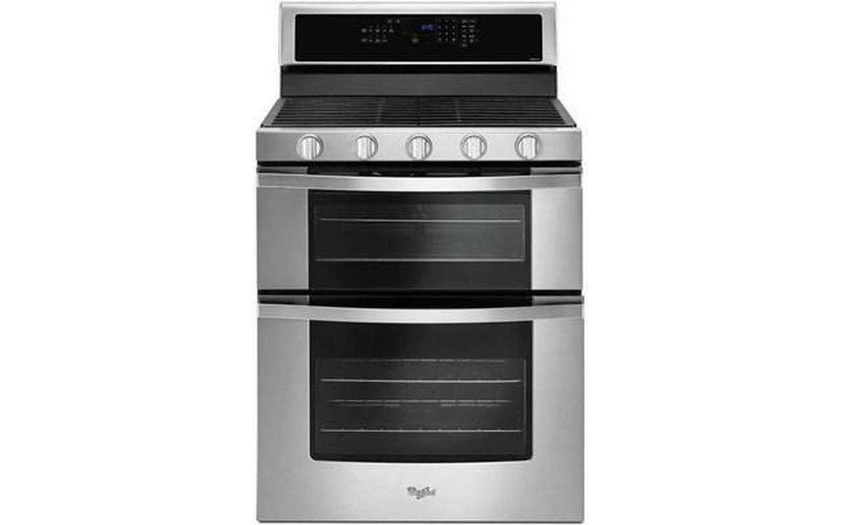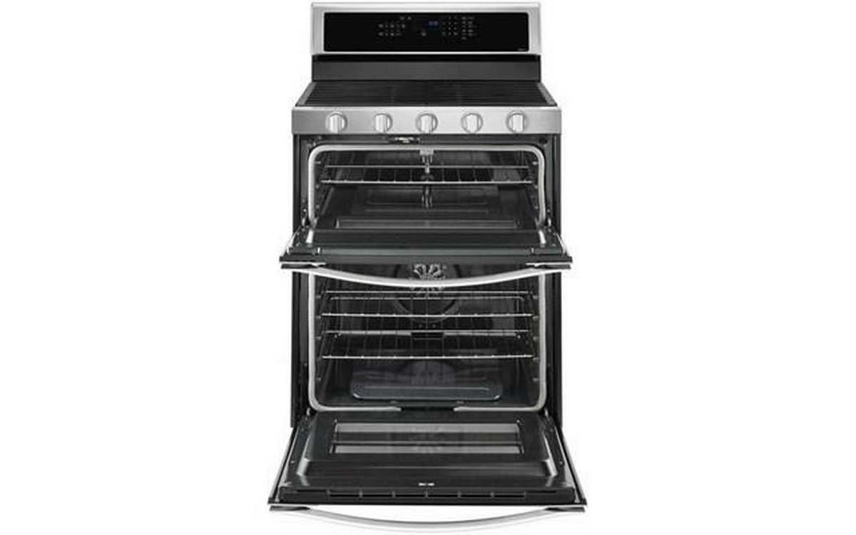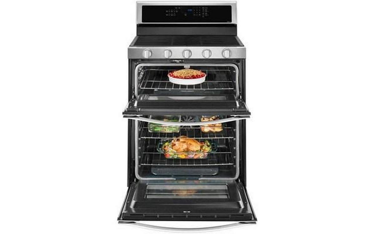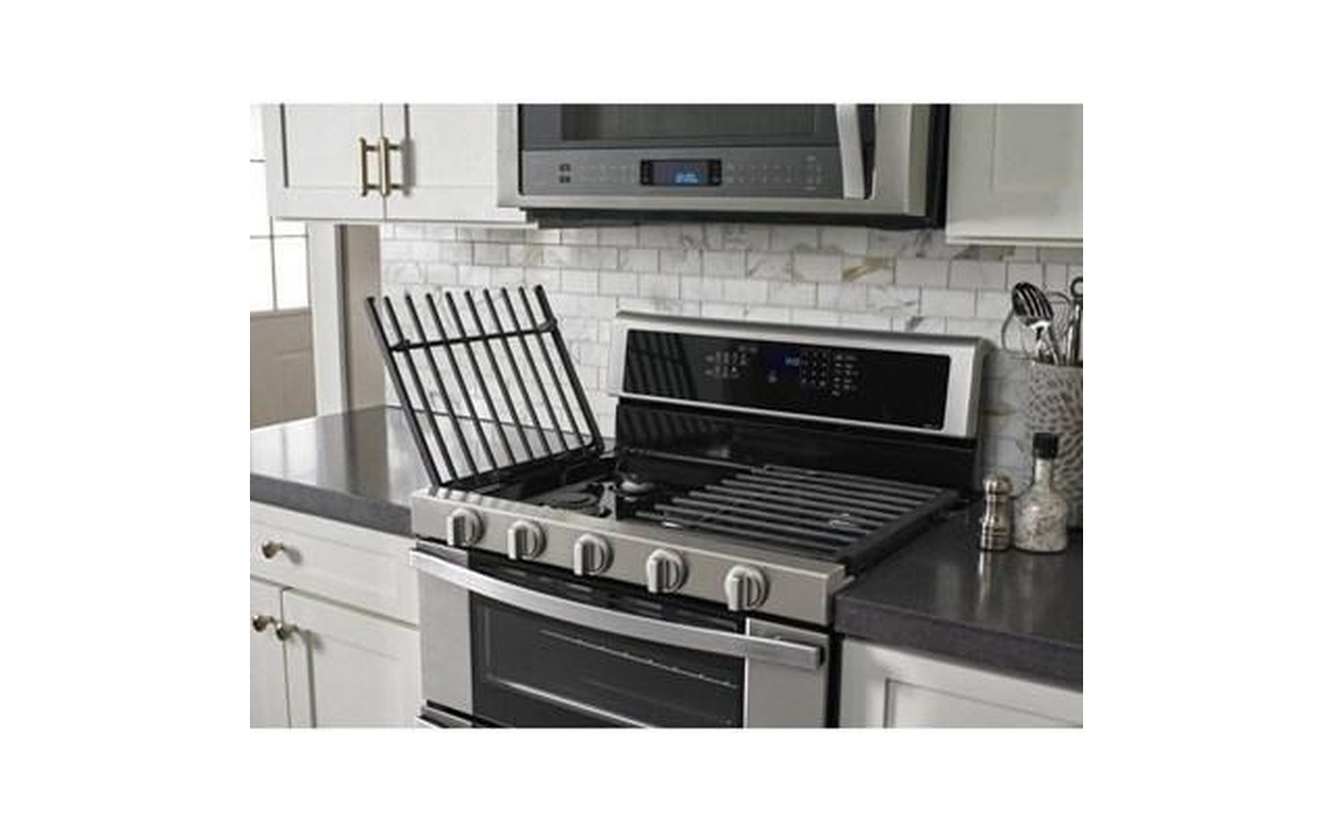 Get dinner on the table quickly with this gas double oven kitchen range. True convection cooking lets you cook food faster. Convection Conversion will do the math for you to adjust cooking times and temperatures. Skip preheating this oven range for frozen favorites like pizza, lasagna, chicken nuggets, fries or pies, thanks to Frozen Bake™ technology. Large griddles and other longer cookware heat evenly on the range stove with the center oval burner. And if you make a mess, EZ-2-Lift™ hinged cast-iron grates provide quick access to wipe up spills on the kitchen range's cooktop.