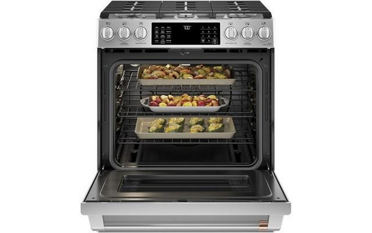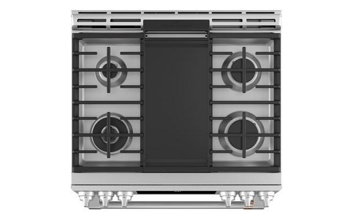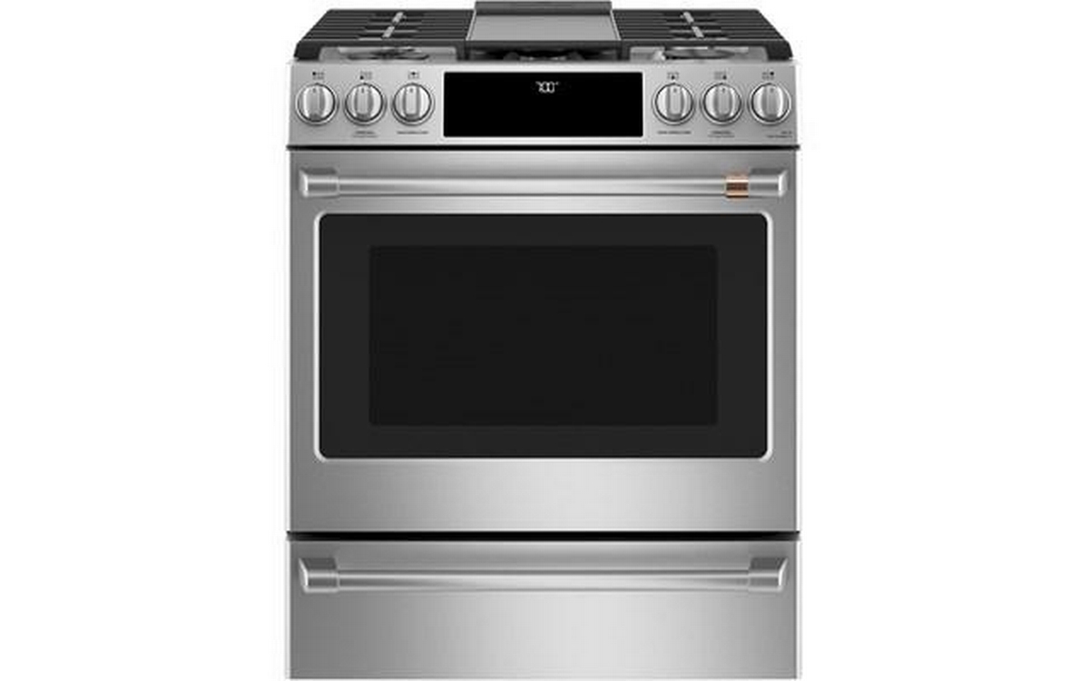 This Café® 30-inch gas, slide-in range features true European convection with Precise Air and auto self clean. This is a slide-in range for those who love to cook. The edge-to-edge cooktop with six versatile burners also includes an integrated griddle to easily handle large meals and family favorites. An integrated temperature probe ensures that meats are prepared to the perfect doneness.