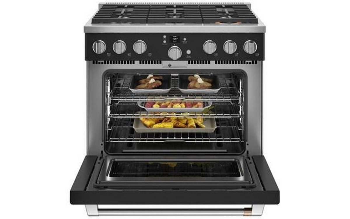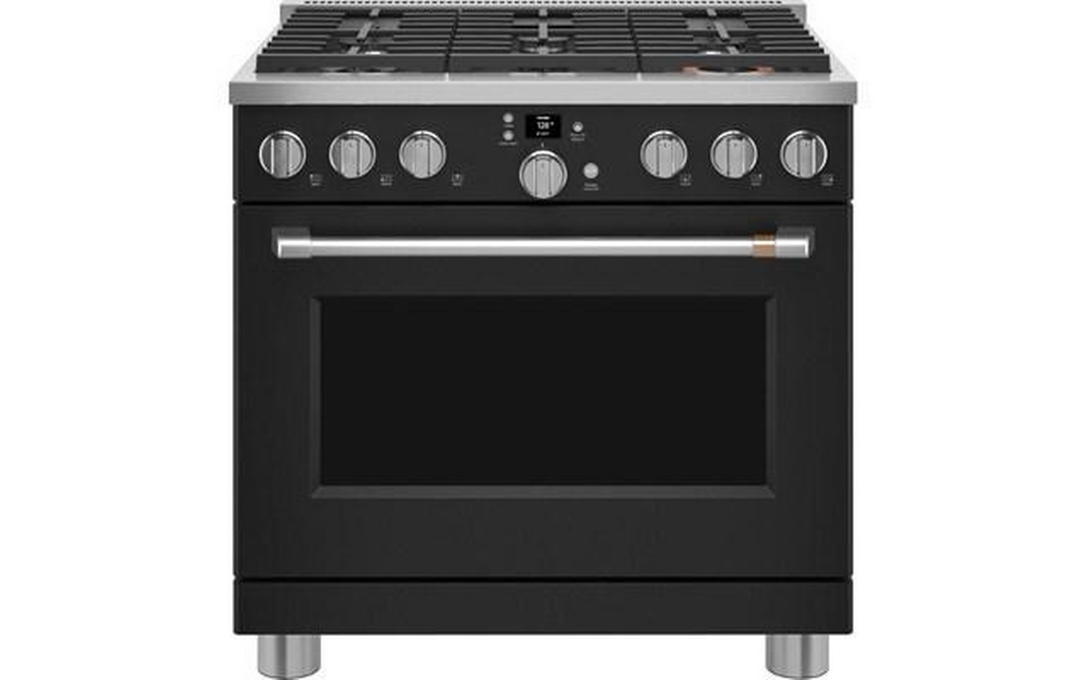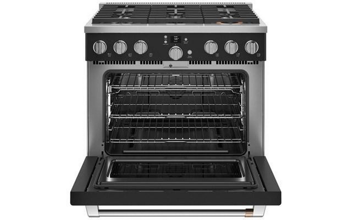 This 36-inch wide Café gas range features 6 cooktop burners, WI-FI connect, Convection Technology and a total oven capacity of 6.2 cu.ft.