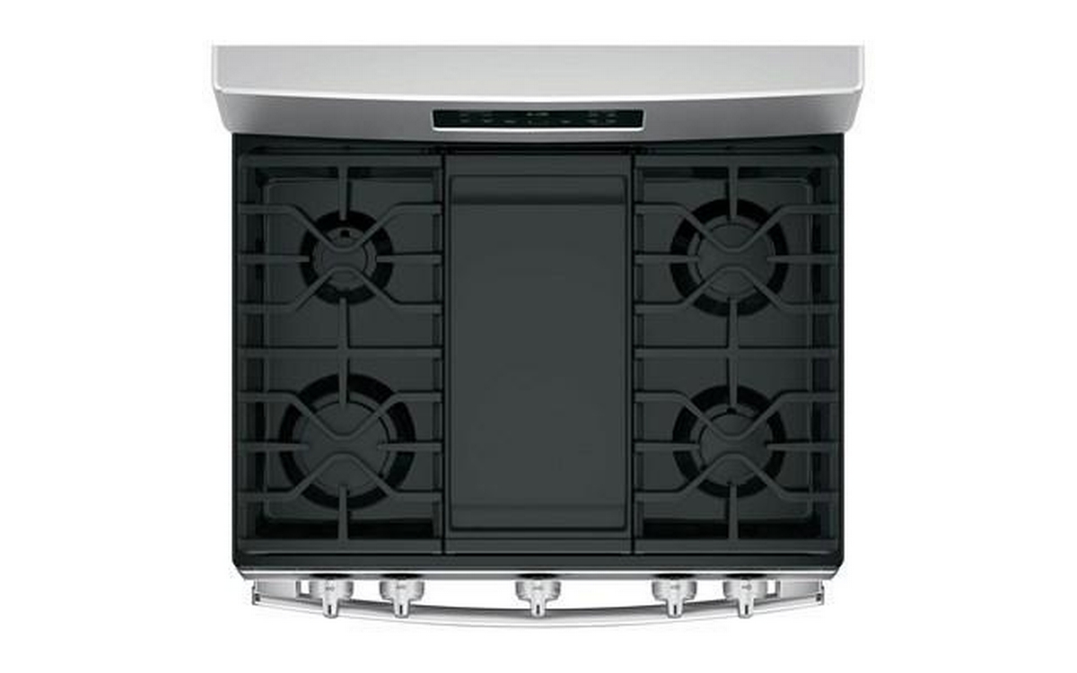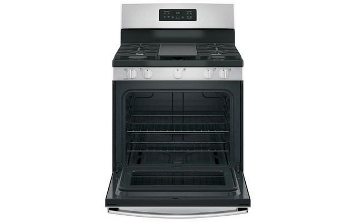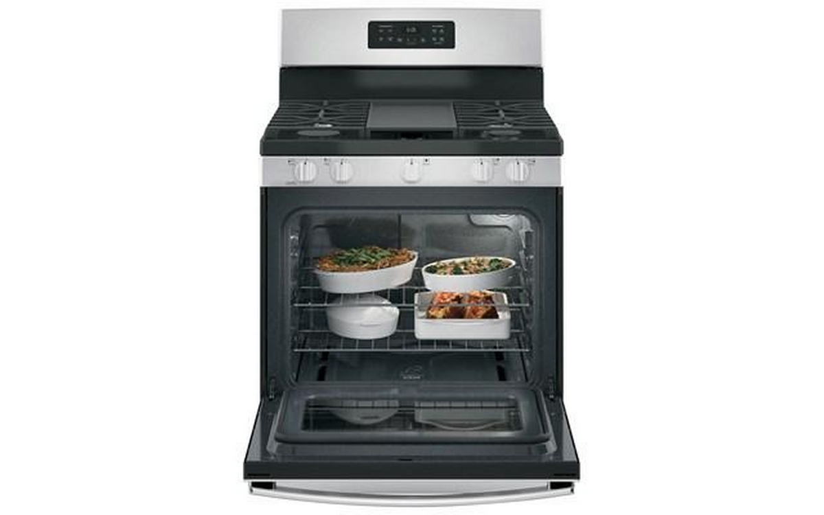 This GE 30" freestanding steam clean gas range with a 5.0 cu. ft. oven capacity offers a spacious cavity for baking and broiling multiple dishes at once, while the sealed gas burners offer instant heat and precise simmering. When it's time for cleanup, don't sweat thanks to the one-piece cooktop and Steam Clean option.