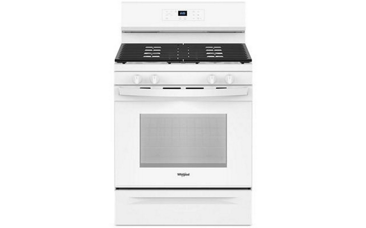 Whirlpool 30-inch freestanding gas range features 4 cooktop burners, a digital display, and a storage drawer.
