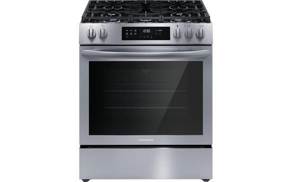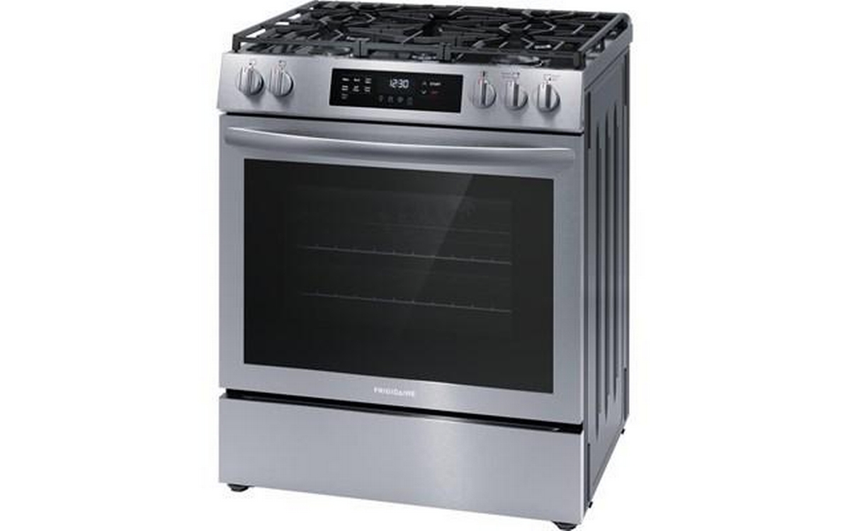 Frigidaire 30-inch freestanding gas range features digital display, Convection technology and 5 cooktop burners.