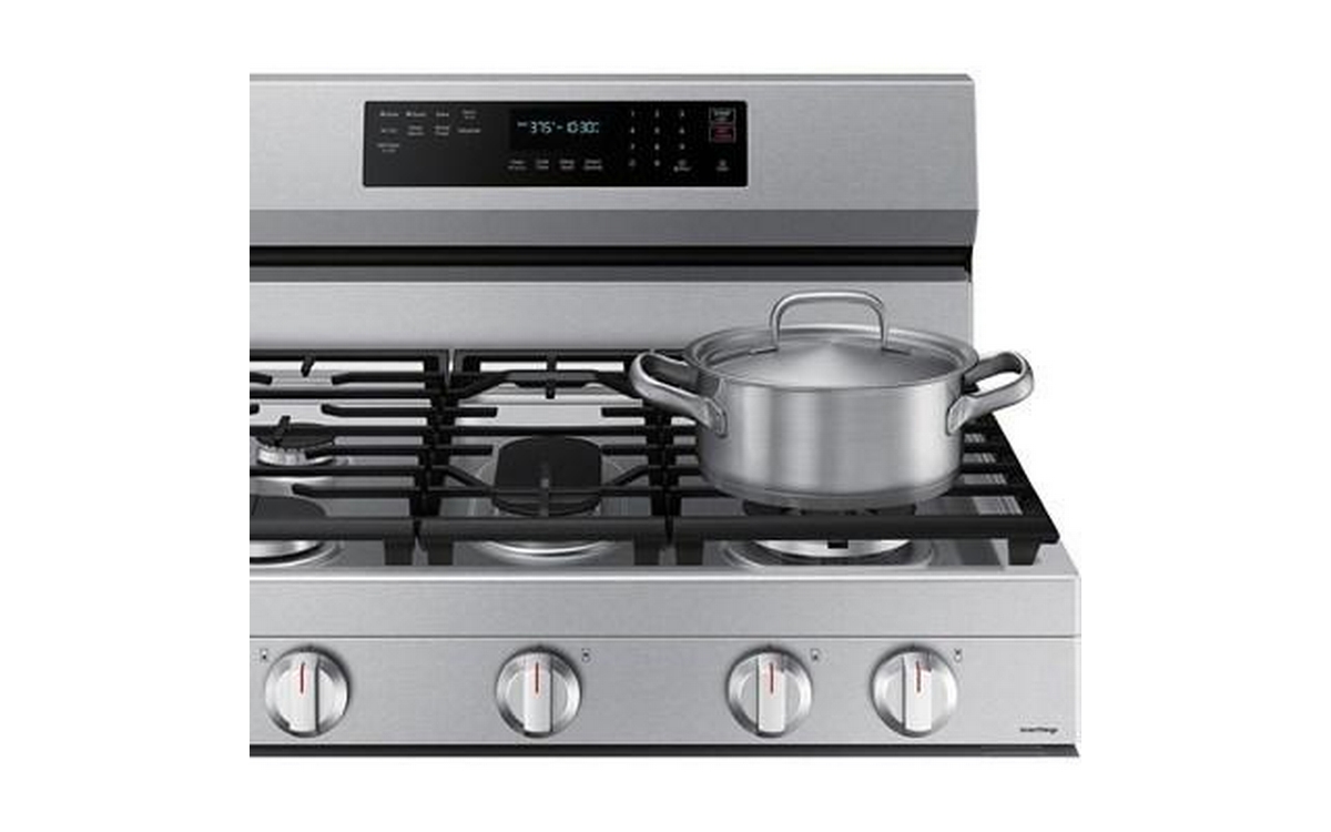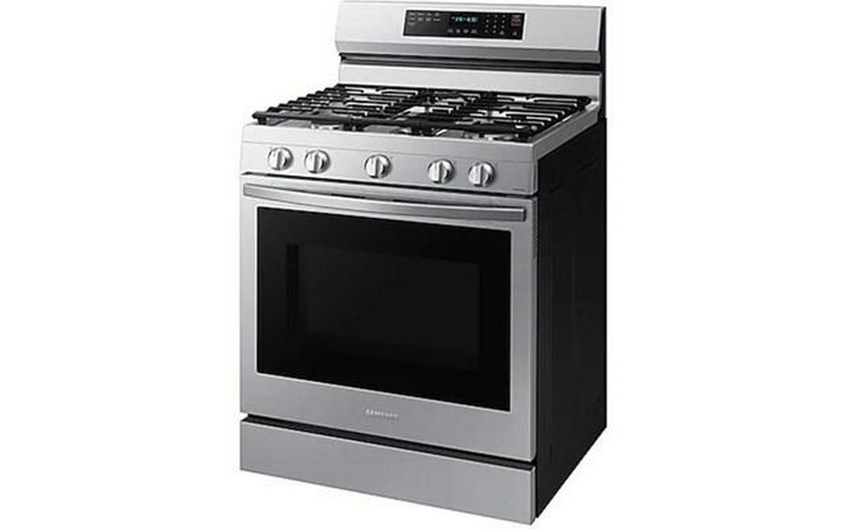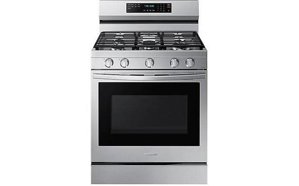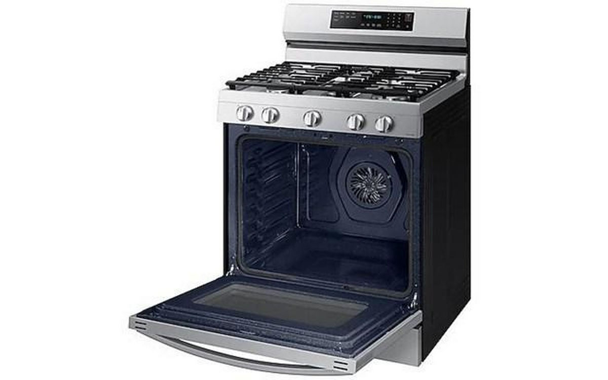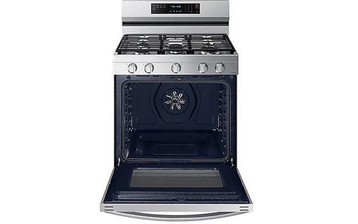 This Samsung gas range features 5 cooktop burners, Wi-Fi connectivity, Convection+ Technology and a total oven capacity of 6.0 cu.ft.