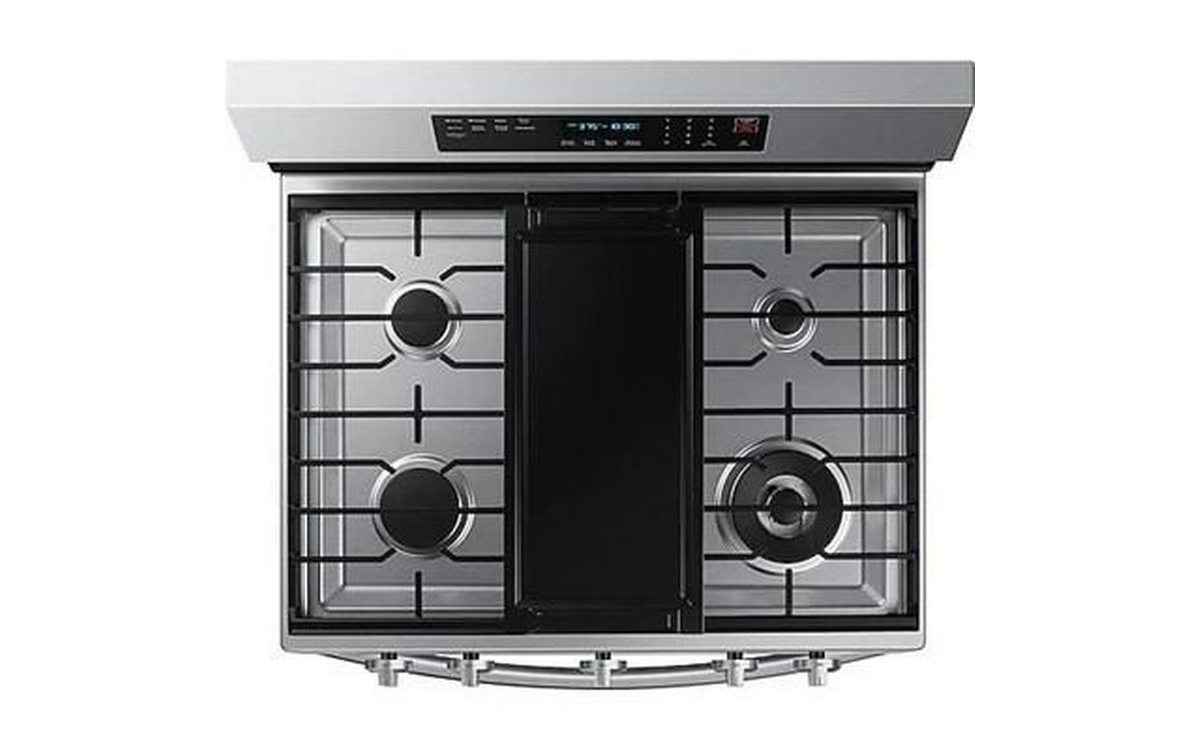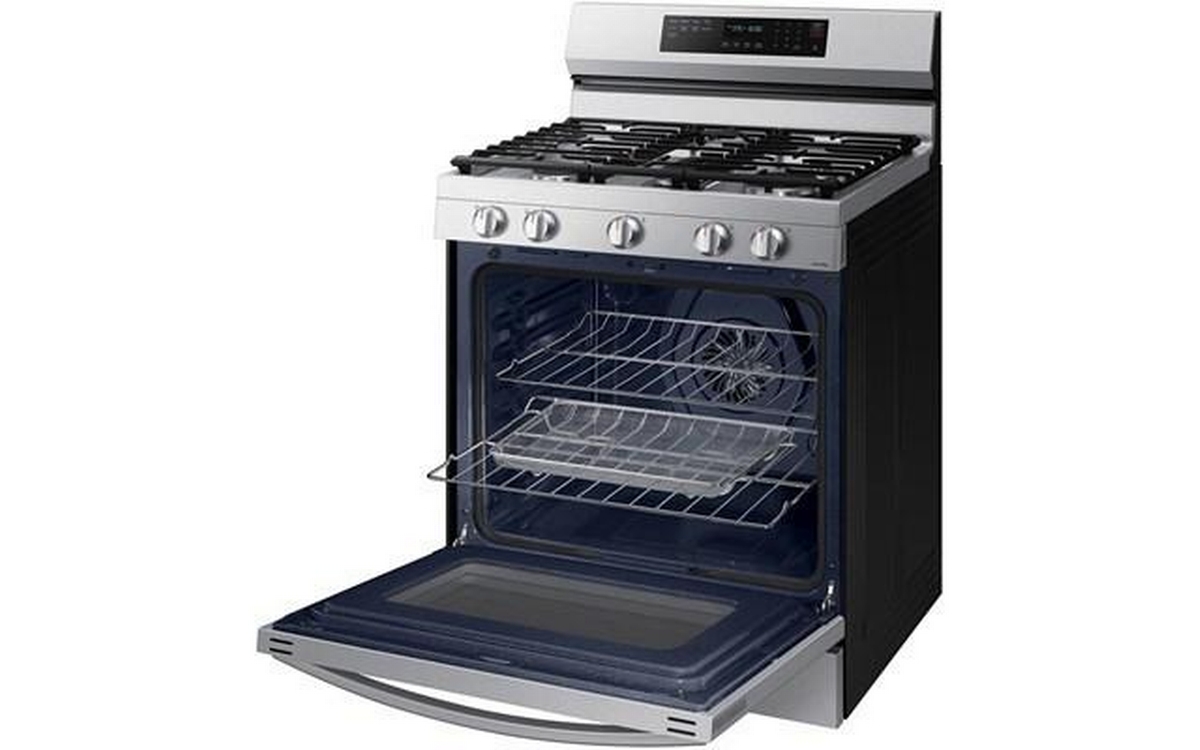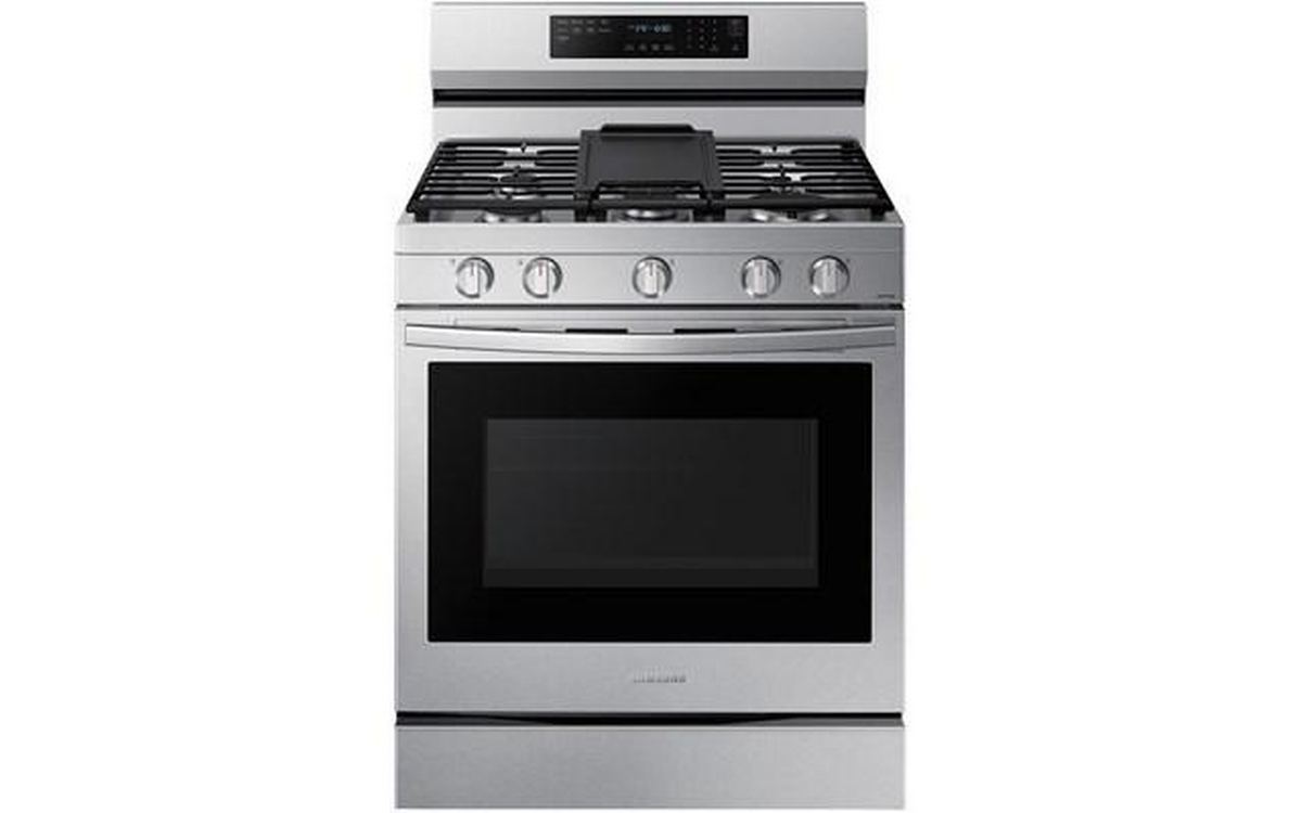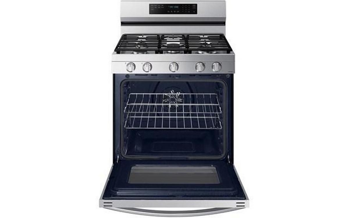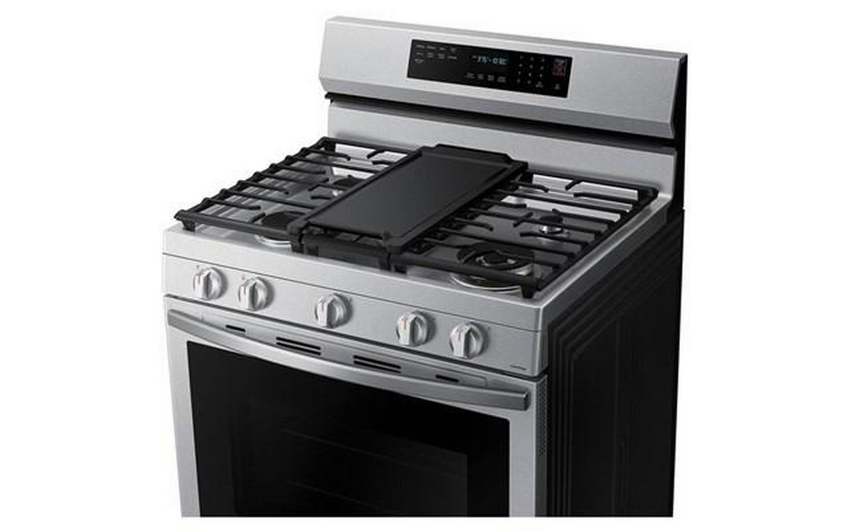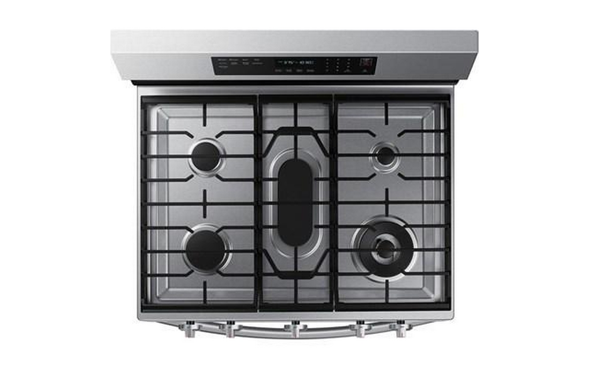 This Samsung gas range features 5 cooktop burners, Wi-Fi connectivity, Convection+ Technology and a total oven capacity of 6.0 cu.ft.