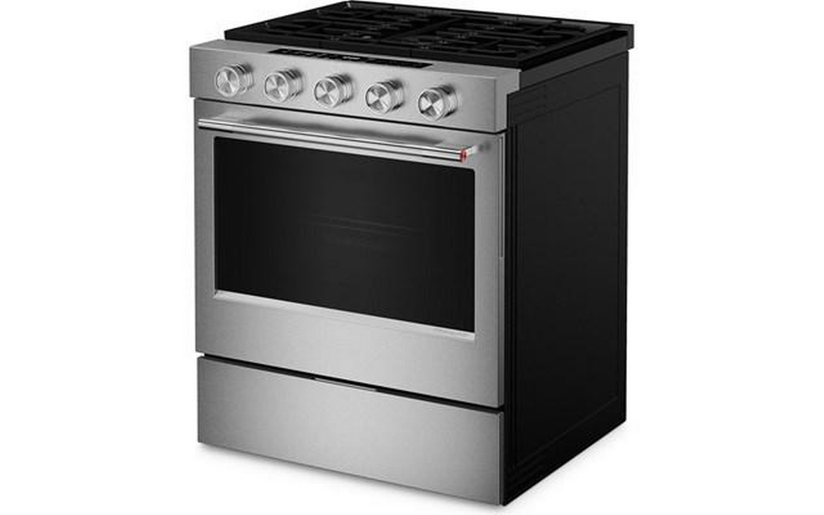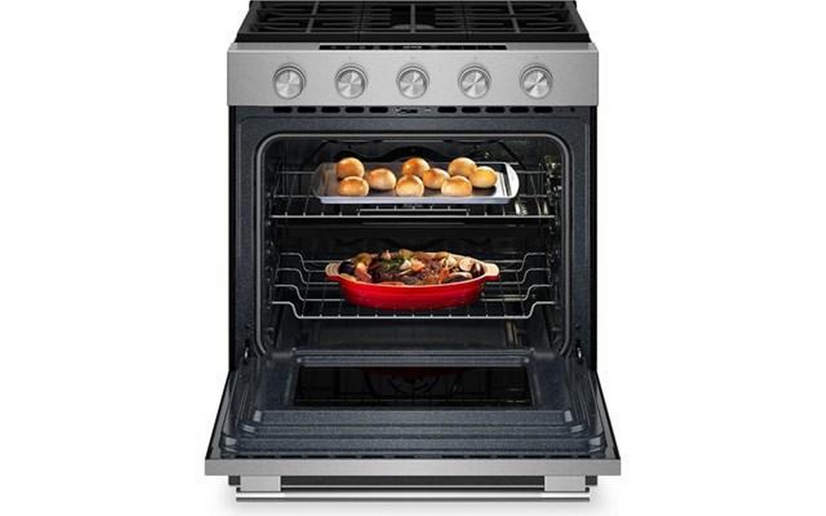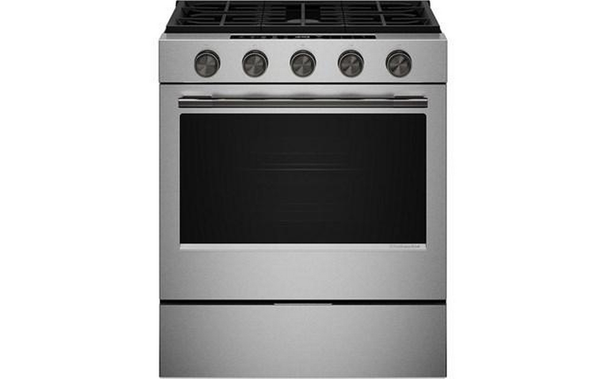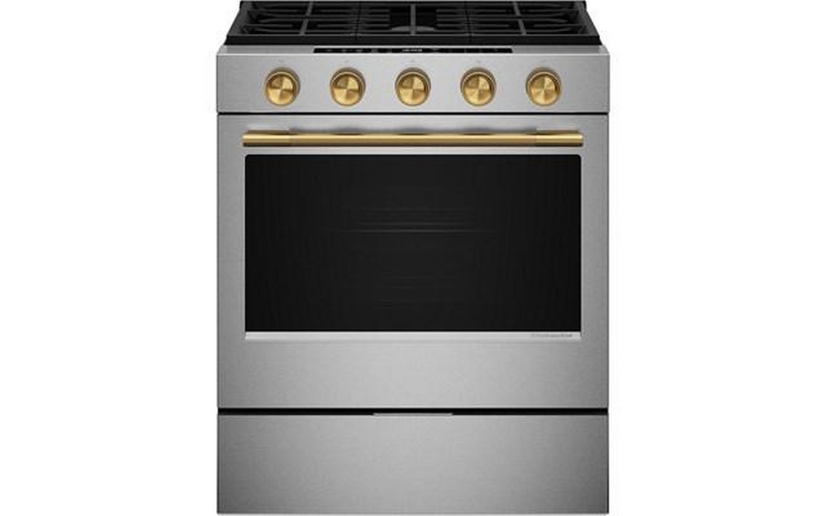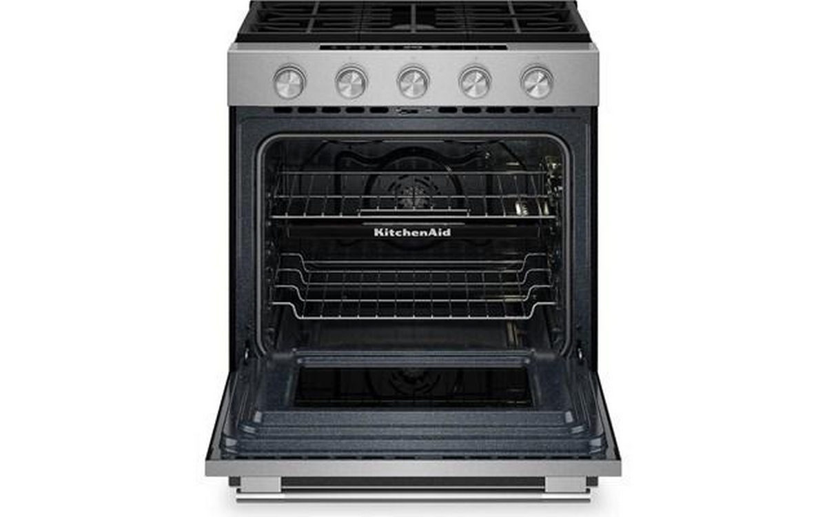 KitchenAid 5.0 Cu. Ft. Smart Slide-in Gas Range with Convection Cooking Modes and 2-in-1 Burner. Enjoy a range of possibilities with our most powerful KitchenAid 30-inch Gas Range available, featuring the industry’s most powerful and largest 2-in-1 burner for an unparalleled and versatile cooking experience. Convection Cooking Modes help you get consistent results with optimal temperatures. A Steam Bake mode works with the included steam rack to provide additional moisture during baking, so you can enjoy Basque cheesecake and other delicious desserts. The range is designed to be personalized with a curated palette of exterior finishes and mixed metal hardware. It’s also a Wi-Fi-enabled Smart Appliance model with smart features and mobile app experience.