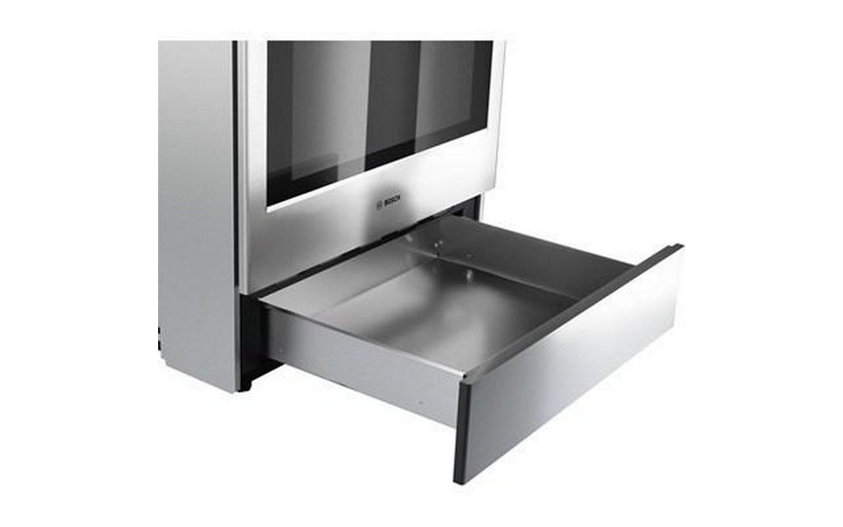 Bosch 30" slide-in range 800 Series fits in any freestanding range cutout. This range features 5 sealed burners, a 4.8 cu.ft. convection oven, heavy-duty metal knobs and a powerful 18,000 BTU center burner. The Bosch warming drawer keeps your meals warm and is great for preheating plates.