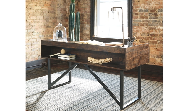 For fans of urban industrial design, this desk steals the show. Tabletop is crafted with a mix of acacia veneer and wood beautified with an oiled walnut-tone finish. Sleek tubular metal frame and linear, large-scale pulls pull it all together. Cutout shelf on desk’s front side incorporates added dimension.