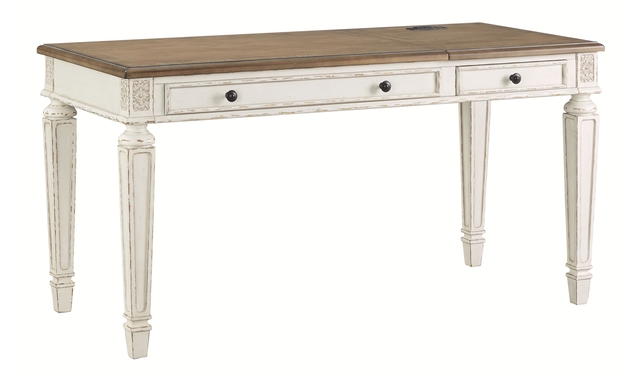 Elevating the art of traditional cottage styling, this desk is your heavenly home office realized. Antiqued two-tone aesthetic blends a chipped white with a distressed wood tone top for added charm. Framed drawer fronts, decorative corbels and elegantly turned and tapered legs add refinement, while dark bronze-tone knobs lend a classic touch. Spring lift top raises the surface to a comfortable standing position, for a healthy alternative. Built for looks and productivity, the built-in power supply and dual USB ports keep your devices close at hand and ready to go.