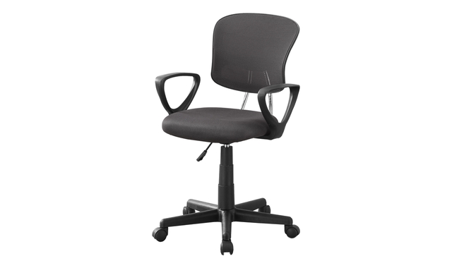 Sized especially for kids, this small desk chair will provide your child with a supportive, comforTable place to sit when they work and play. It features an ergonomically designed, extra-wide backrest that curves to promote good posture and a padded seat with a soft feel. A convenient lever underneath the seat allows the chair to be adjusted to the best height for your child's size. A swivel seat and a stable, 5-star base with casters that roll smoothly in all directions make moving the chair easy?and fun! You and your child will give this juvenile, mid-back office chair with fixed armrests in black and grey mesh fabric good grades for its support, comfort, and functionality.