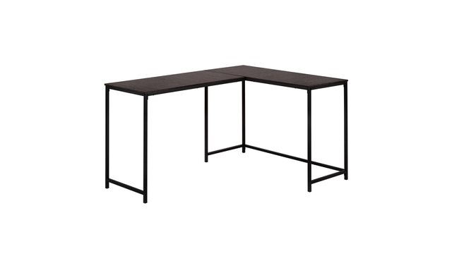 Delivering the best of both worlds, this corner computer desk is both spacious and compact, with a streamlined style that is a great choice for smaller home offices. Finished in a dark brown espresso laminate, the large desktop easily accommodates everything you need to be productive and has room to spare for displaying decorative items. Supporting the desktop is a slender metal base in a complementary black finish. The open design of the metal base leaves plenty of room underneath the desktop to stretch your legs and place a computer tower. This L-shaped computer desk is designed for placement in a corner to maximize space in a home office.