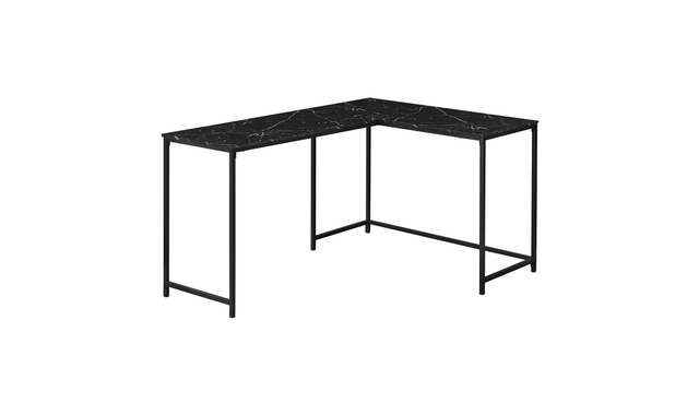 Delivering the best of both worlds, this corner computer desk is both spacious and compact, with a streamlined style that is a great choice for smaller home offices. Finished in a black marble-look laminate, the large desktop easily accommodates everything you need to be productive and has room to spare for displaying decorative items. Supporting the desktop is a slender metal base in a matching black finish. The open design of the metal base leaves plenty of room underneath the desktop to stretch your legs and place a computer tower. This L-shaped computer desk is designed for placement in a corner to maximize space in a home office.