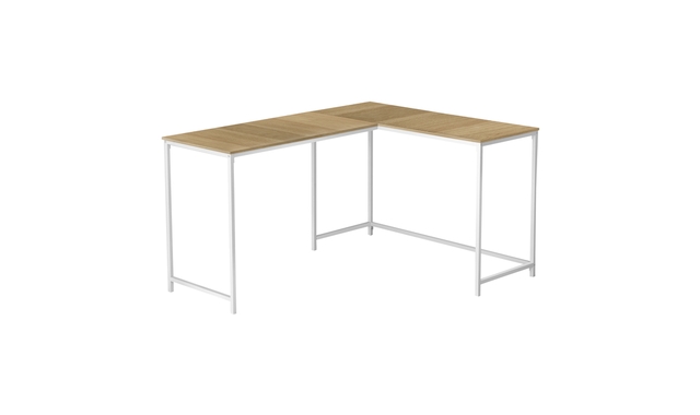 Delivering the best of both worlds, this corner computer desk is both spacious and compact, with a streamlined style that is a great choice for smaller home offices. Finished in a natural wood-look laminate, the large desktop easily accommodates everything you need to be productive and has room to spare for displaying decorative items. Supporting the desktop is a slender metal base in a contrasting white finish. The open design of the metal base leaves plenty of room underneath the desktop to stretch your legs and place a computer tower. This L-shaped computer desk is designed for placement in a corner to maximize space in a home office.