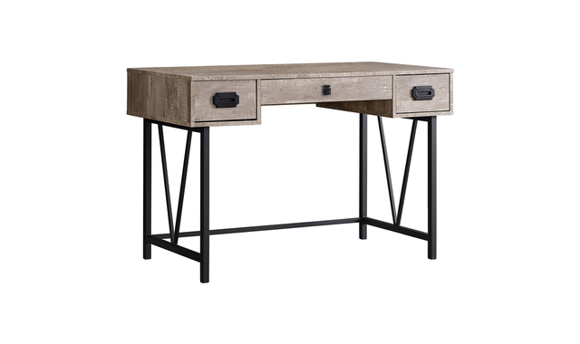 Industrial meets rustic charm in this highly functional contemporary designed computer desk. Accented with strong black metal legs in a unique design, with plenty of storage that includes two side drawers with retro style metal pulls, and a wide middle drawer with a leather pull, all on smooth metal glides. The spacious tabletop constructed with thick paneling, in a smooth laminate taupe reclaimed wood-look finish can easily hold your computer and other office essentials. This stylish computer/writing desk will be a standout whether you place it in a corner of your living room, family room, or home office space.