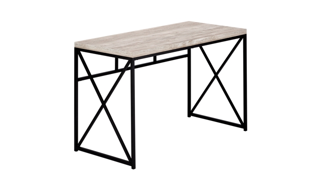 Space saving is a breeze with this compact desk that is sized for small homes, apartments or condos. Featuring a modern, wide open design, this desk finished in a taupe reclaimed wood look is equally functional as a computer desk or writing table. A sturdy black metal X-design base ensures stability and offers lots of space to push in a chair. The thick panel top is perfect for a laptop/tablet, a lamp, a notebook and some important supplies to get the job done.