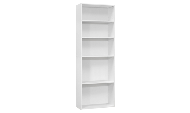 This 5-shelf bookcase in a simple, clean and space-saving design makes it a versatile storage option for any room in your home. The strong adjusTable shelving allows for various sized objects to be displayed in your own creative way. Constructed from engineered materials in a freshwhite laminate finish, this transitional style bookcase can easily be used in a living room, home office, or bedroom to store books, toys, and decorative accents. Tipping hardware is included to secure safely to a wall. Assembly is required.