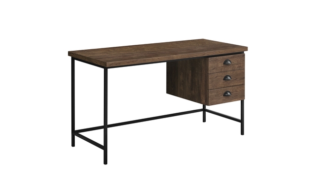 Add some style with practical substance to your work space with this simple and contemporary, clean-lined computer desk. The smooth laminate, in a rustic brown reclaimed-wood look finish on all sides, is offset by the industrial inspired black square tube metal leg for a modern element. The 3 storage drawers on metal glides are accented with black metal cup style drawer pulls, keeping your office essentials tucked away but within easy reach. The compact size is ideal to place this desk in a hallway, bedroom, or any designated home office space. Assembly is required.