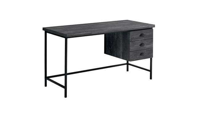 Add some style with practical substance to your work space with this simple and contemporary, clean-lined computer desk. The smooth laminate, in a sophisticated black reclaimed-wood look finish on all sides, is offset by the industrial inspired black square tube metal leg for a modern element. The 3 storage drawers on metal glides are accented with black metal cup style drawer pulls, keeping your office essentials tucked away but within easy reach. The compact size is ideal to place this desk in a hallway, bedroom, or any designated home office space. Assembly is required.